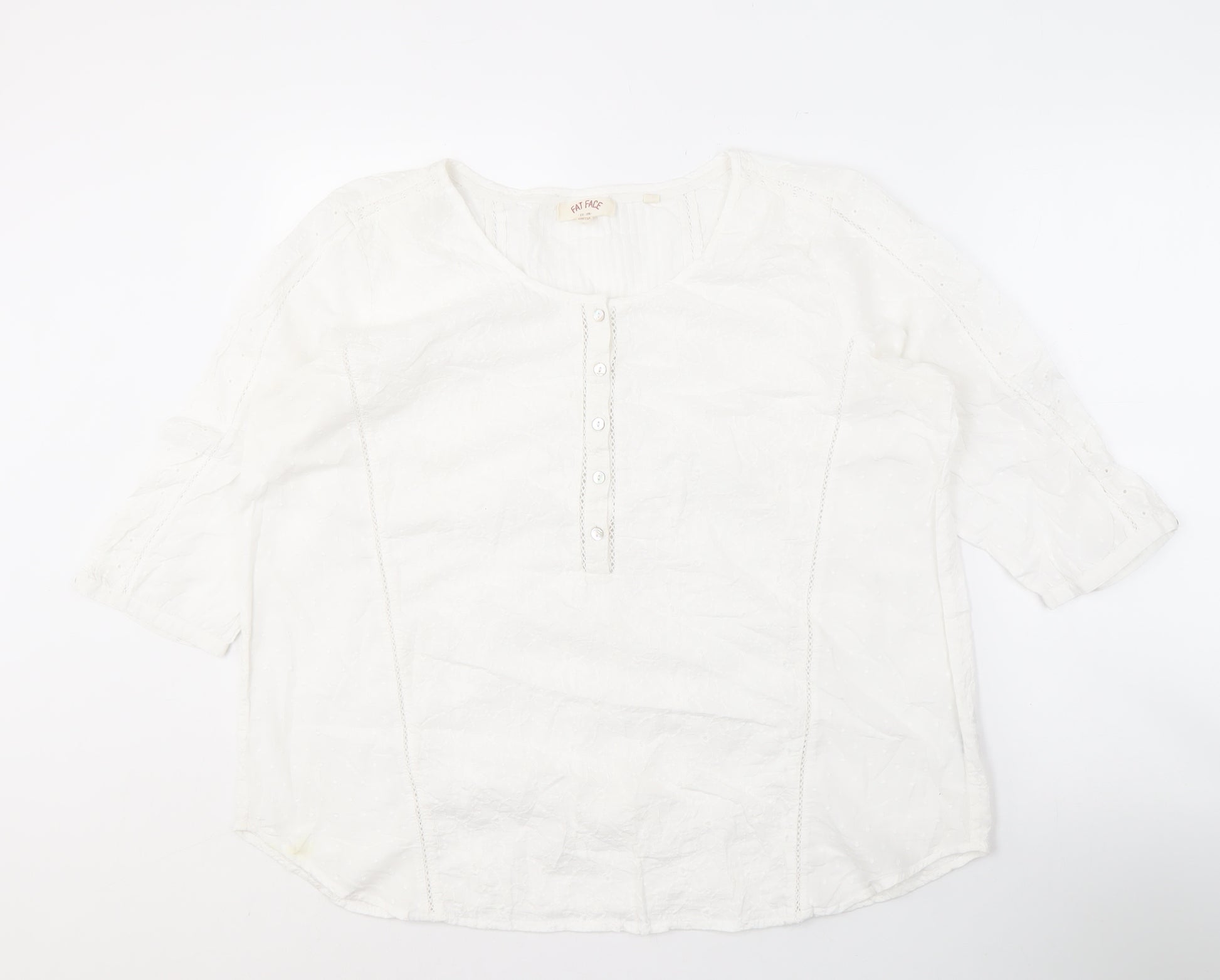 Discover effortless charm with this Fat Face Women's White Blouse. Made entirely of breathable cotton, this blouse offers a comfortable fit for day-long wear. The classic round neck and 3/4 sleeves add a touch of sophistication, making it perfect for casual settings. Adorned with button accents, this blouse brings a subtle flair to your wardrobe. Machine washable for easy care, the blouse is ideal for anyone seeking comfort without compromising on style. Available in size 18, this garment caters to regular sizes, offering a regular fit that's universally flattering. The white colour palette makes it a versatile piece that can be paired with diverse bottoms. Slightly wrinkled with light wear, this blouse is in good condition, offering both warmth and style. Ideal for casual occasions, this blouse will quickly become a staple in any sophisticated wardrobe. Don't miss out on adding this piece to your collection; it promises timeless elegance and everyday usability.