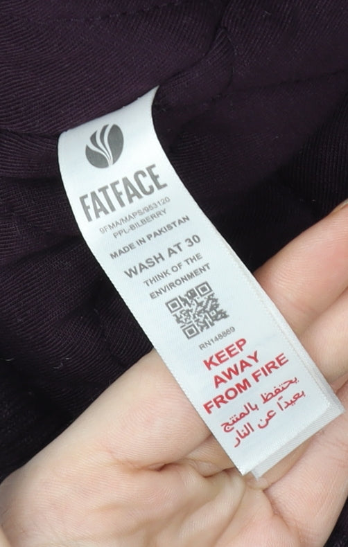 Stay cosy and stylish with this Fat Face women's hooded zip jacket, crafted from soft 100% cotton for a warm and comfortable feel. Designed in a rich purple tone, it features a full front zip, ribbed cuffs and hems, and a practical hood with drawstrings for adjustable comfort. The jacket includes convenient front pockets, perfect for keeping your hands warm or storing daily essentials. Lined with polyester for gentle insulation, it's ideal for cooler autumn and winter days when you want reliable warmth without bulky layers. The classic fit flatters a range of shapes and sizes, while the high-quality cotton construction reflects Fat Face’s reputation for durable and well-made casual clothing. The zip fastening adds convenience, making it easy to wear open or closed depending on your style or the weather. Subtle branding on the chest delivers a refined and understated look that pairs beautifully with jeans, leggings, or casual trousers for versatile everyday wear. Perfect to throw on for outdoor strolls, relaxed weekends, or travel, this jacket is both practical and effortlessly smart. The relaxed yet flattering silhouette ensures freedom of movement, while the dark purple colour adds a touch of sophistication to your casual wardrobe. In very good pre-owned condition, this Fat Face jacket shows only light linting consistent with gentle use and remains clean and well maintained. Its machine washable design makes care straightforward, ensuring it remains a go-to piece for seasons to come. Smart, functional, and comfortable, this Fat Face women’s cotton zip hoodie is a wardrobe essential for anyone who values quality craftsmanship and timeless style at an affordable price point.
