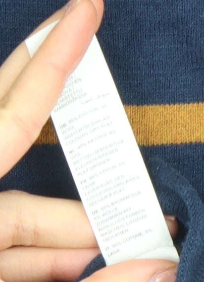 Keep your young one warm and stylish in this classic FatFace 'Young Crew' striped jumper, perfect for the cooler seasons. Crafted from soft and breathable cotton with a touch of added fibre, this navy blue and mustard striped piece offers a refined yet fun look that's ideal for school days or weekend adventures. The jumper features a collared neckline with a three-button Henley-style placket, giving it a timeless and versatile design that’s easy to pair with jeans, chinos, or joggers. Designed for boys aged 11-12 years, the long-sleeve pullover offers comfort and freedom of movement while keeping a sharp appearance. Its classic fit and lightweight cotton knit make it a great transitional piece suitable for autumn through to spring. The neat embroidered FatFace logo on the chest adds a subtle touch of brand detail, reinforcing its quality craftsmanship. This FatFace jumper shows minimal signs of prior wear but remains in excellent condition overall, with no holes or major marks visible. FatFace is well known for creating durable and comfortable casualwear, and this jumper is no exception. Ideal for layering under a jacket on cold days or wearing alone on mild evenings, it provides both practicality and classic charm. Easy to care for and machine washable, it’s perfect for active kids who enjoy everyday adventures. If you’re looking for a stylish, reliable, and cosy jumper to refresh your child’s wardrobe, this FatFace navy and mustard striped jumper will make a fine addition — combining comfort, quality, and British casual charm in one piece.