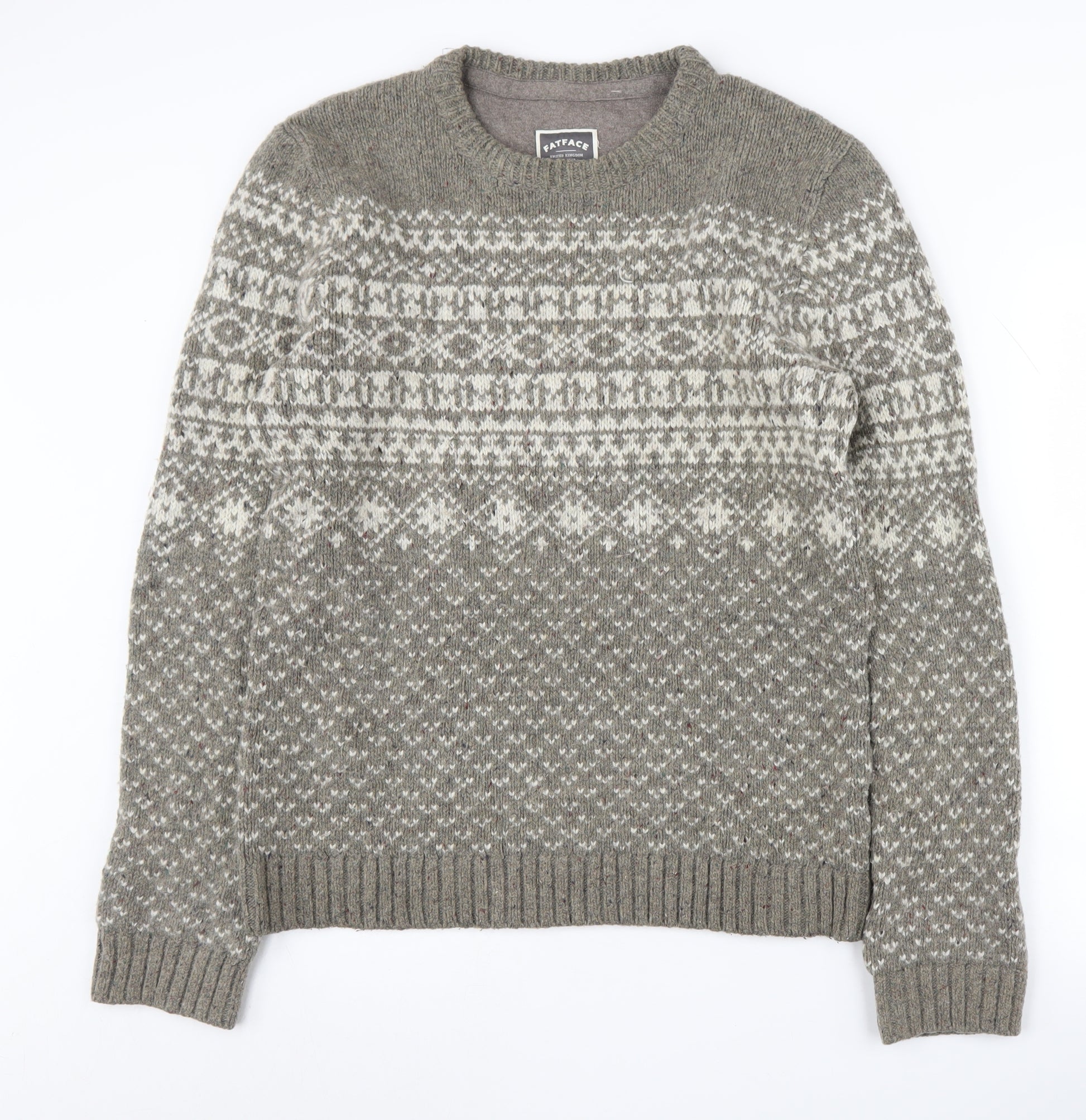 Discover timeless style and comfort with this FatFace men's pullover jumper. Crafted from a warm and durable blend of wool, acrylic, and nylon, this jumper features a striking Fair Isle pattern in an appealing shade of grey. Its regular fit and crew neck design make it a perfect choice for both casual autumn and winter days. Machine washable for easy care, this knitwear piece promises all-season versatility and is ideal for layering. Whether you're relaxing at home or heading out for a casual outing, this FatFace jumper will keep you looking stylish and feeling cosy. The classic theme and regular size fit make it a must-have addition to any wardrobe.