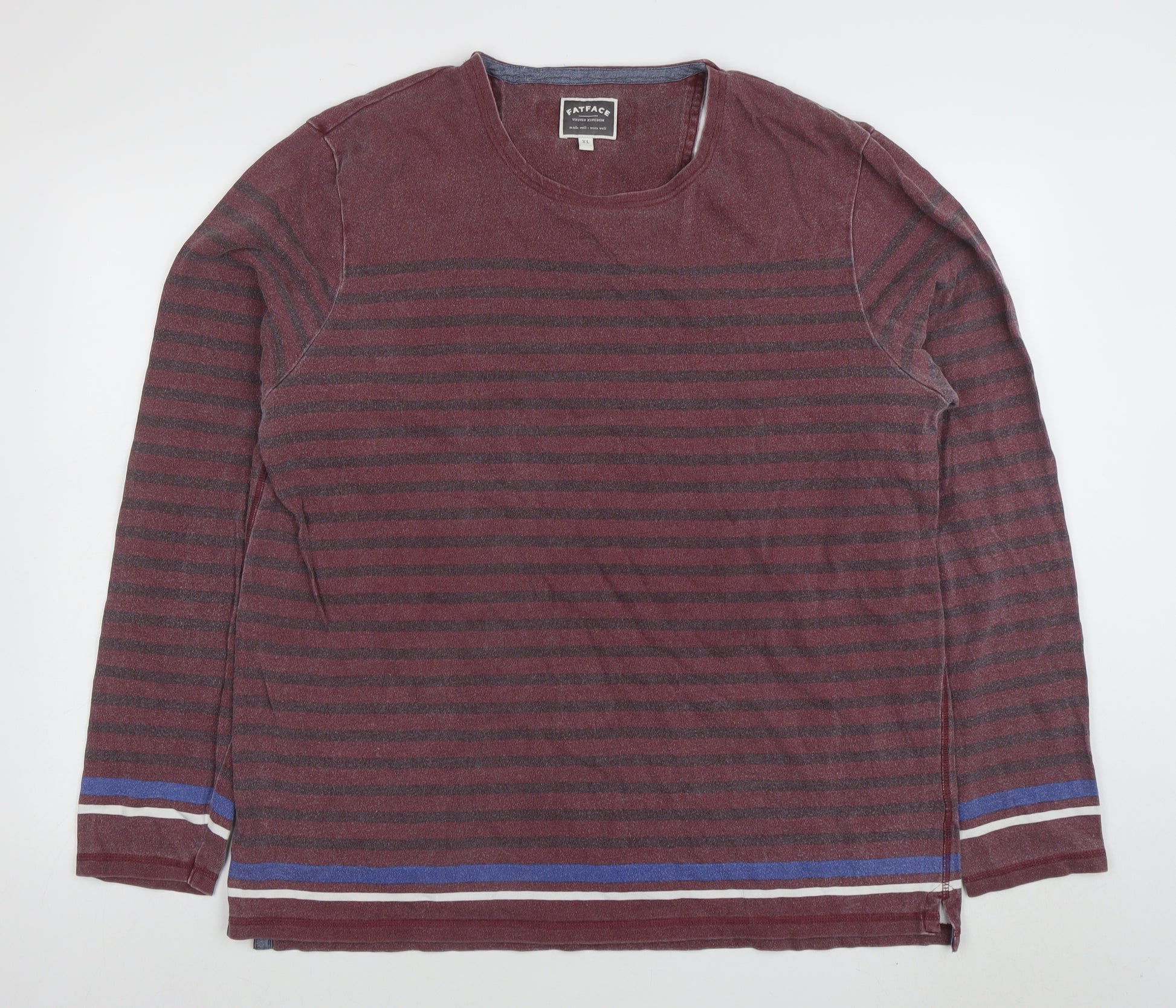 This FatFace men's red striped sweatshirt is a stylish and versatile addition to your casual wardrobe. Crafted from 100% soft cotton jersey, it provides breathable comfort that’s ideal for layering on cooler days or wearing on its own during milder months. The classic crew neck and regular fit make it a timeless option for weekend wear, offering ease of movement and a comfortable silhouette. The red and charcoal horizontal stripe pattern adds subtle texture and visual appeal, while blue and white accents at the hem and cuffs give the jumper a modern edge. Designed for everyday wear, it’s perfect for autumn, spring and winter seasons, pairing effortlessly with jeans or chinos for a relaxed yet polished look. The lightweight fabric ensures all-day comfort, and its FatFace craftsmanship guarantees quality and durability. This sweatshirt has been pre-worn but remains in very good condition with only minimal signs of gentle wear. Ideal for those who appreciate durable, well-made casualwear with a laid-back British aesthetic. Whether you’re heading to the pub, taking a coastal stroll, or relaxing at home, this FatFace sweatshirt delivers easy-going refinement and comfort. Machine washable for simple care and maintenance. A dependable pullover with timeless appeal, combining relaxed styling and heritage-inspired design typical of FatFace’s trusted craftsmanship. Don’t miss the chance to own a versatile piece that will quickly become a go-to favourite in your wardrobe.