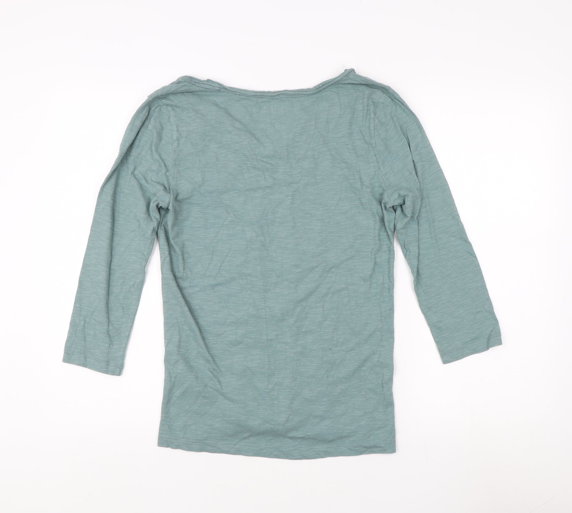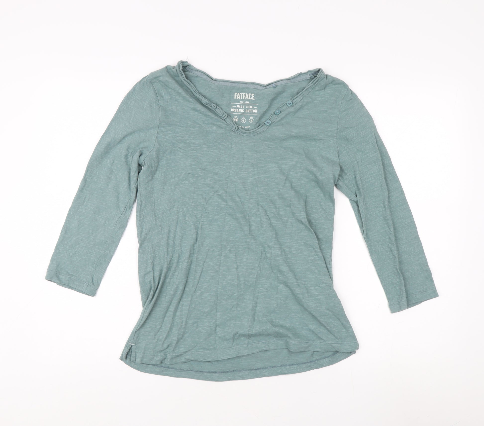 Add a touch of casual sophistication to your wardrobe with this FatFace Women's T-Shirt. Crafted from organic cotton, this blue top offers ultimate comfort and breathability, making it an excellent choice for any casual occasion. The basic style is enhanced by a flattering V-neckline and a button accent, giving it a stylish edge. Designed for the regular fit, it features 3/4 sleeves which are perfect for mild weather conditions typical of spring, summer, and autumn. Easy to care for, it’s machine washable, making it a practical addition to any wardrobe. Despite showing minimal signs of wear, it remains in excellent condition, promising durability and lasting style.