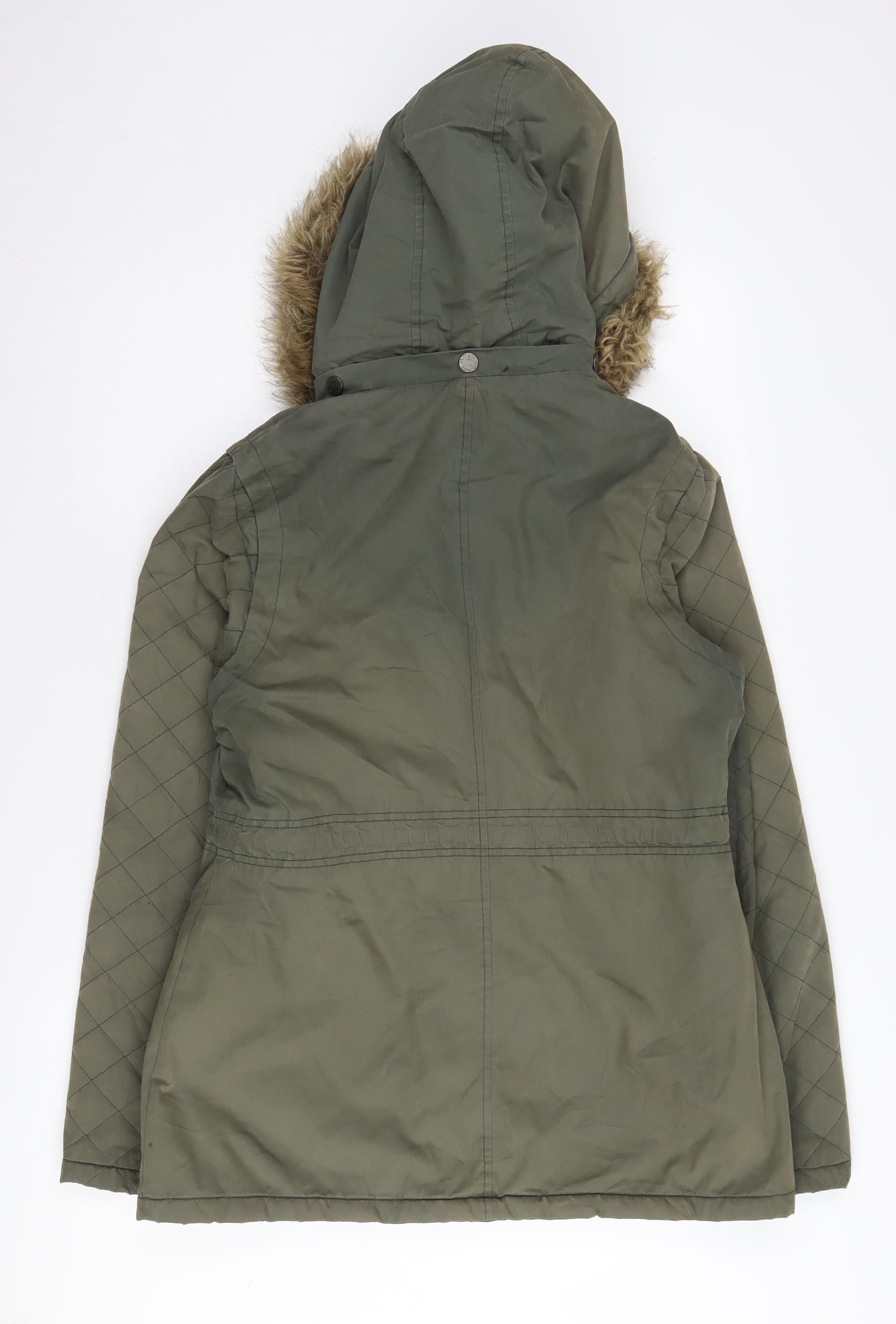 Step into colder months with style and comfort in this Fatface Women's Parka Coat. Designed with a practical and stylish hood, this green mid-length jacket blends fashion with everyday functionality. The parka features a soft cotton outer shell enhanced with nylon for durability, ensuring you stay warm and protected during brisk weather. Whether you're heading to work, running errands, or enjoying a day out, this jacket is an excellent choice for versatility and ease of wear. The cosy polyester lining provides additional warmth, while the removable lining offers adaptability throughout the seasons. Detailed with a fur-trimmed hood and attractive quilted accents, this jacket paints a picture of classic outdoor styling. Snap and zip closure ensure a secure fit, and multiple pockets add practicality and space for essentials. With its premium features and appealing design, this Fatface parka is more than just a piece of outerwear; it's a wardrobe staple for autumn and winter. Despite slight wear, it remains in excellent condition, providing excellent value for a stylish and functional piece. Reliable for everyday casual outings, this parka is a must-have for the fashion-forward woman appreciating functionality and trend.