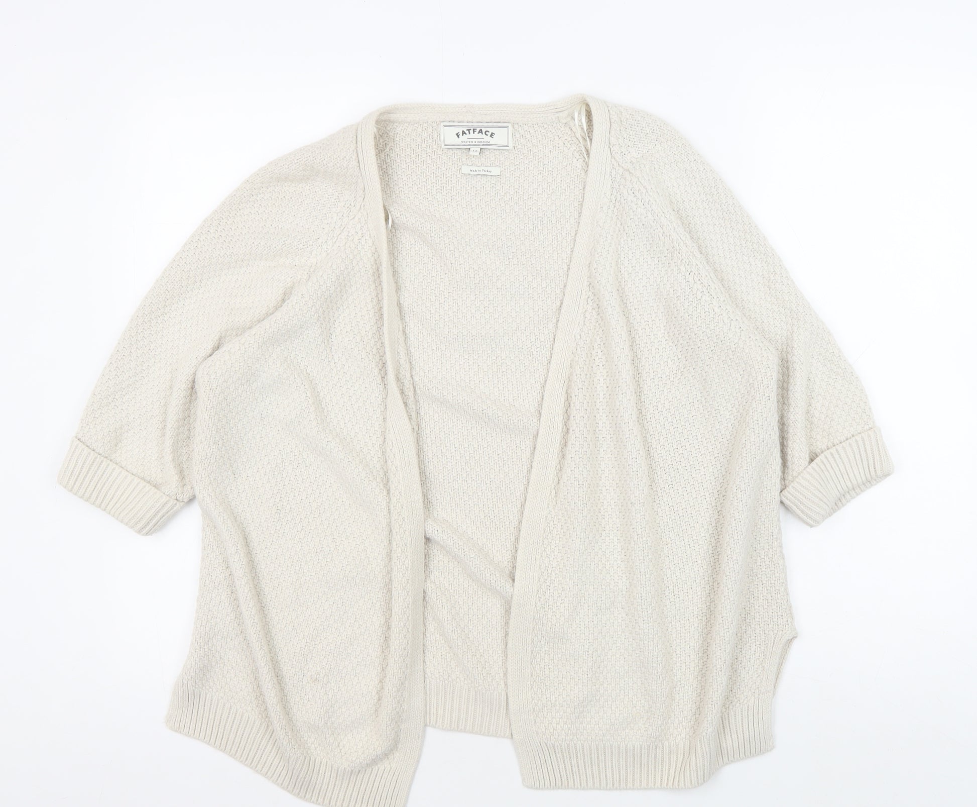 Step into effortless style with this FatFace Women's Cardigan, perfect for those seeking comfort and elegance. Made from 100% cotton, this ivory, open knit cardigan is ideal for the spring season. Its regular fit and raglan 3/4 sleeves provide a comfortable and flattering silhouette. Designed with a casual, open front, it pairs beautifully with a wide range of outfits, making it a versatile addition to any wardrobe. You can easily transition from day to night, whether you're heading to work or a casual outing with friends. This cardigan is machine washable, offering convenience and ease of care. Despite being preloved, it is in excellent condition, showing gentle signs of wear but no noticeable defects. Priced at a competitive £15.75, it’s a stylish yet affordable choice for those who appreciate quality fashion without breaking the bank. Whether layered over a dress or paired with jeans, this cardigan ensures you stay chic and comfortable.