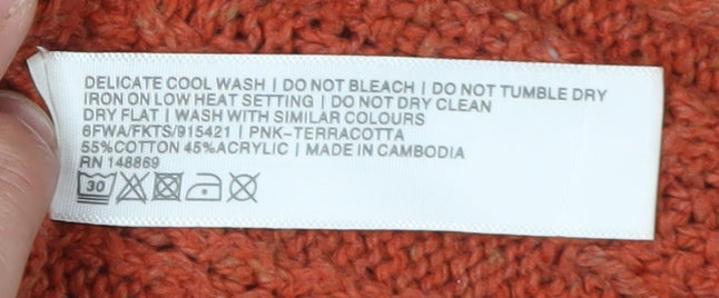 Elevate your everyday wardrobe with this stylish FatFace Women's Jumbo Cable Knit Pullover. Crafted in a vibrant orange hue, this jumper proudly features a classic crew neck design, made from a comfortable blend of cotton and acrylic. This piece showcases a timeless cable-knit pattern that adds an extra element of texture and interest to your look. Perfect for layering, the long sleeves offer warmth, making it ideal for transitioning through the seasons. Designed for machine washing, it offers ease of care. Despite being gently worn, it retains its excellent condition with no visible defects. Whether paired with jeans for a casual outing or dressed up with a skirt and boots, this FatFace jumper is a versatile addition to any fashion-forward wardrobe. Don’t miss the chance to make this chic and practical piece yours.