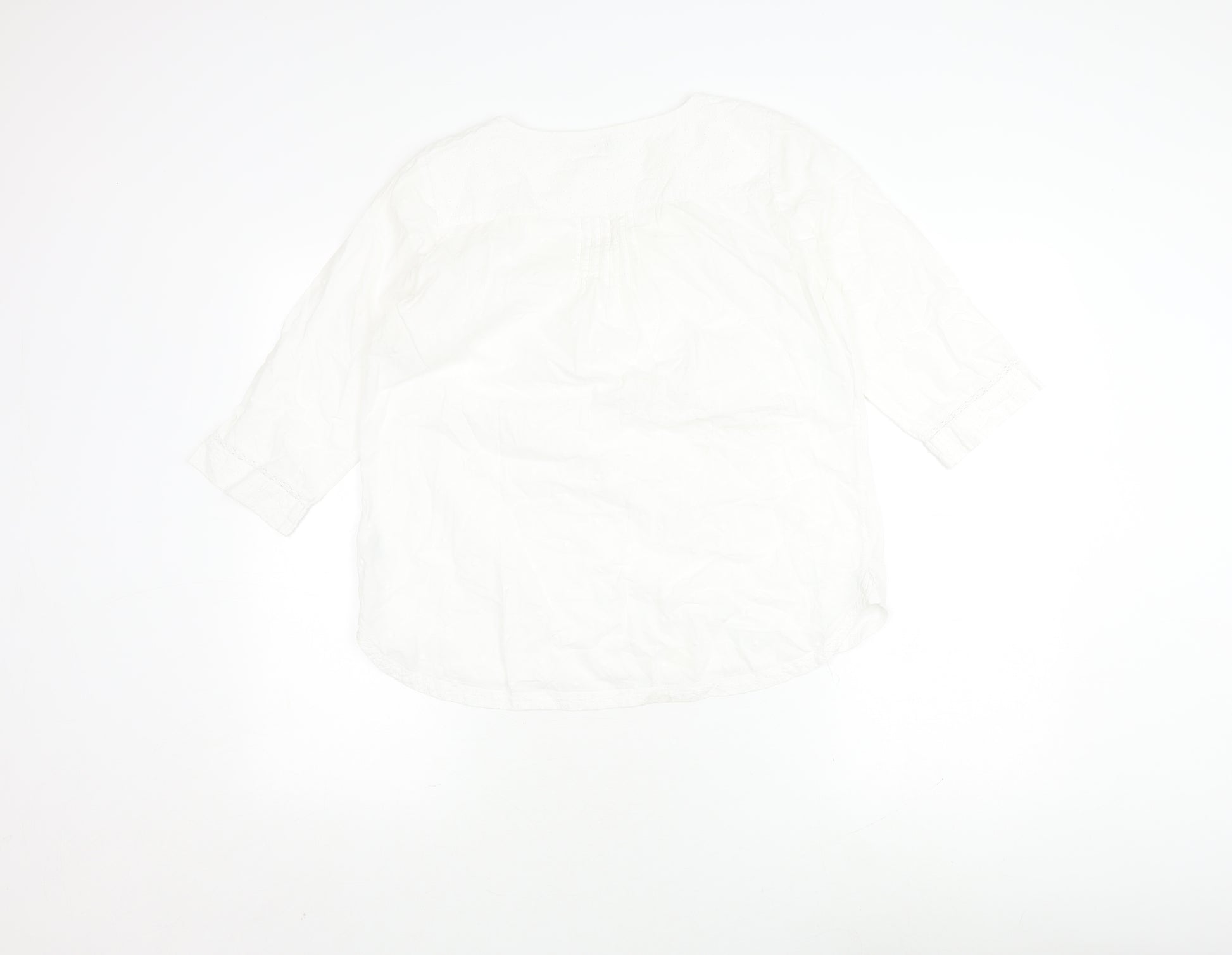 Discover elegance and comfort with this FatFace Women's White Cotton Blouse, perfect for casual outings in the warmer months. Crafted from 100% cotton, this blouse offers softness and breathability, ensuring comfort throughout the day. Ideal for spring and summer, the solid white colour provides a fresh, versatile look that pairs effortlessly with any outfit.Featuring a stylish V-neckline and 3/4 sleeves, this blouse brings a touch of sophistication to your wardrobe. The regular fit ensures a relaxed yet flattering silhouette, making it suitable for various body types. The blouse is equipped with a button closure for easy wearing and a classic/fitted sleeve for a chic appearance.Whether you're headed to a brunch with friends or a casual day at the office, this blouse transitions seamlessly from one occasion to another. Although pre-loved, it remains in good condition with a slight stain near the front, as shown in the image. But don’t let that deter you; the simplicity and charm of this blouse make it a must-have addition to your collection.Machine washable, it offers convenience for frequent wear, maintaining its quality through every wash. Embrace the effortless style this piece offers and feel confident wearing it for any casual occasion. A true wardrobe staple, the FatFace blouse combines practicality with style, delivering an unbeatable fashion experience.