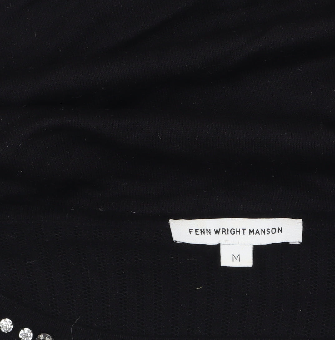 This elegant Fenn Wright Manson women's black jumper is the perfect choice for effortless sophistication and comfort. Crafted from a premium viscose and polyamide blend with a hint of Lurex for subtle sheen, it offers a lightweight and breathable fabric that feels smooth against the skin. The soft, fine knit design ensures a flattering fit suitable for all-day wear. Featuring a flattering crew neckline adorned with delicate jewel accents, this jumper adds a touch of glamour to any casual or smart-casual look. The long sleeves and regular fit make it a versatile staple piece that transitions seamlessly from day to evening wear. Perfect for pairing with tailored trousers for work or with jeans for relaxed outings, this jumper captures timeless style with a refined twist. Designed for the Autumn and Winter seasons, it provides both warmth and chic appeal without feeling bulky. The minimalist detailing, fine-quality craftsmanship, and understated elegance showcase the brand’s attention to detail. Ideal for women who value comfort and sophistication with a subtle sparkle, this piece is an essential wardrobe addition. In excellent pre-loved condition with only minimal signs of wear, it maintains a smart, well-kept appearance. This Fenn Wright Manson black lightweight knit jumper delivers both practicality and polish, making it an easy favourite for a range of occasions. Get ready to elevate your everyday wardrobe with this beautifully embellished and stylish jumper that effortlessly combines modern sensibility with timeless charm.