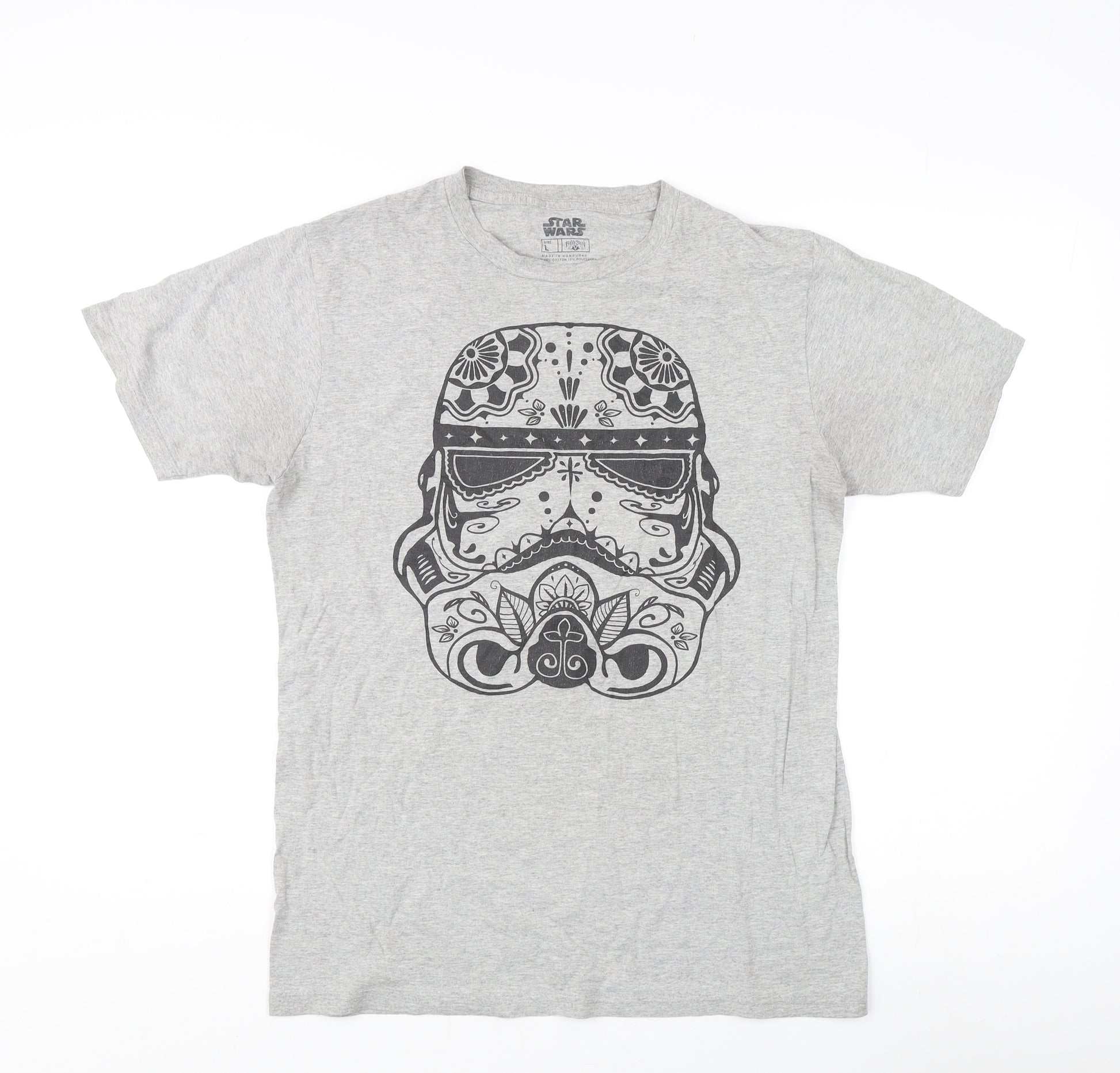 Embrace the force with this fantastic Fifth Sun Men's Star Wars graphic T-Shirt, ideal for every Star Wars enthusiast. Made from a comfortable and soft blend of 90% cotton and 10% polyester, this jersey tee is designed to offer maximum comfort throughout the day. Sporting a striking Stormtrooper design from the iconic Star Wars saga, this shirt is perfect for fans and collectors alike.Available in a size large and suitable for the average build, this grey T-shirt features a classic crew neck and short sleeves, making it an ideal choice for casual outings or lounging at home. The graphic print adds a charming appeal and keeps you connected to the beloved Star Wars universe.This machine washable T-shirt ensures easy care and maintenance, and you can be confident that the vibrant print will remain intact quite long. Its lightweight material and breathable fabric make it suitable for wearing across all seasons. Elevate your wardrobe by adding this unique piece, perfect for Star Wars-themed conventions, movie nights, or simply showing off your fan pride.An excellent condition product with no visible signs of wear, this T-shirt is your go-to attire for both leisure and fandom gatherings.