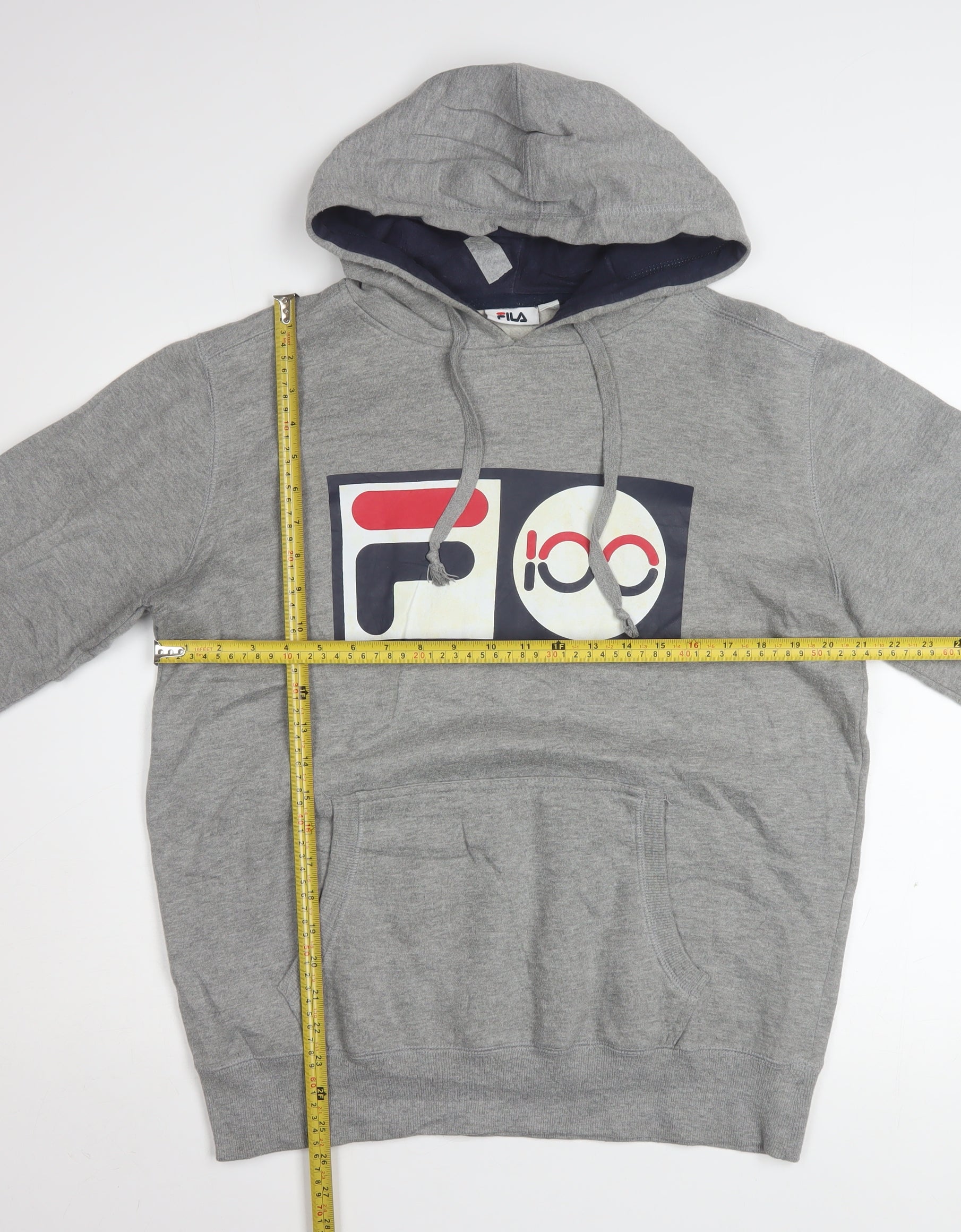 Elevate your casual wardrobe with this stylish FILA men's grey pullover hoodie, designed for both comfort and sporty appeal. Crafted from a soft and durable blend of 80% cotton and 20% polyester, this hoodie provides warmth and breathability, ideal for layering through autumn, spring, and winter. Featuring the iconic FILA logo boldly printed across the chest in red, white, and navy, it captures the timeless athletic spirit that the brand is known for. The fleece fabric offers a cosy feel, while the hood with drawstrings ensures an adjustable fit to keep you comfortable in any setting. A classic kangaroo pocket provides practicality and style, perfect for keeping your hands warm or storing small essentials. With long sleeves, ribbed cuffs, and hem for a secure fit, this hoodie is versatile enough for everyday wear, gym sessions, running errands, or casual outings. The grey colour complements any outfit, making it an essential piece for any wardrobe. The overall condition is excellent, showing only light signs of wear and no damage, ensuring plenty of life left in this quality garment. Designed for regular fit, it offers a relaxed yet flattering silhouette suited to all body types. Easy to maintain with machine-washable fabric, this hoodie combines sporty design and everyday convenience. Whether you are heading to the gym, out for a walk, or simply relaxing at home, this FILA hoodie will keep you comfortable and stylish. A perfect choice for those who appreciate iconic branding and lasting quality, it effortlessly blends fashion with functionality.
