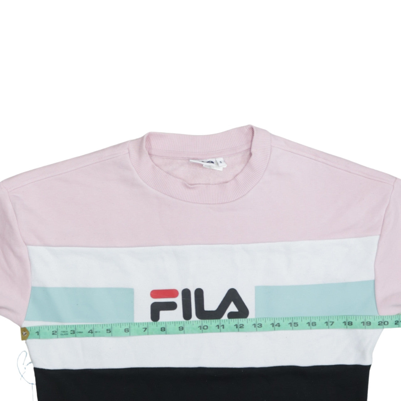 Bring a hint of sporty style and comfort to your casual wardrobe with this women’s FILA colourblock sweatshirt. Crafted with a soft blend of cotton and polyester, this pullover delivers both warmth and breathability, making it a great choice for everyday wear. The sweatshirt features a pink upper section contrasted with a clean white band bearing the iconic FILA logo across the chest, complemented by a pale mint stripe and a solid black lower half for a bold, modern look. Designed with a classic crew neckline and ribbed cuffs and hem, it offers a flattering, regular fit that keeps its shape over time. Perfect for layering in cooler months or wearing on its own during brisk days, this sweatshirt fits seamlessly into a laid-back wardrobe. Pair it effortlessly with jeans, joggers or leggings for a relaxed yet fashion-forward aesthetic. Whether you’re heading to a casual outing, walking in the park, or lounging at home, this FILA sweatshirt adds a pop of colour and vintage-inspired athletic charm. With its durable fabric, easy-care design, and instantly recognisable branding, it’s a piece built to last and impress. Conditioned in excellent used shape, this item shows minimal wear and retains bright colour and structure, promising extended comfort and casual appeal for seasons to come.