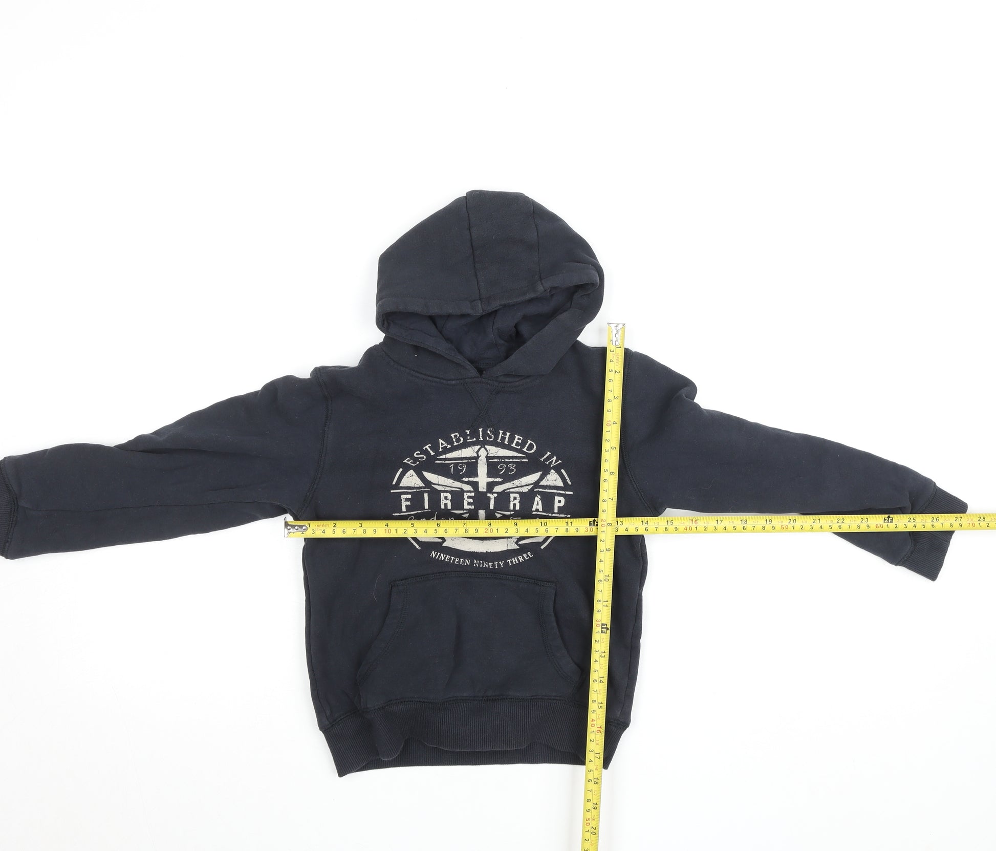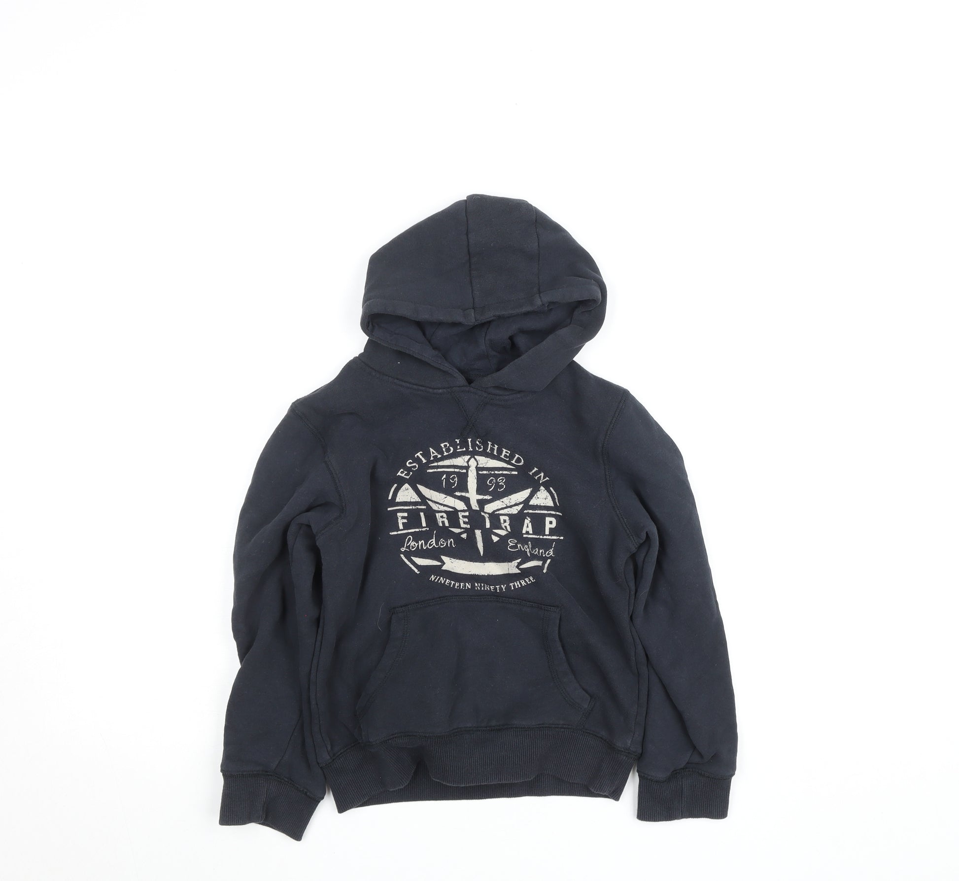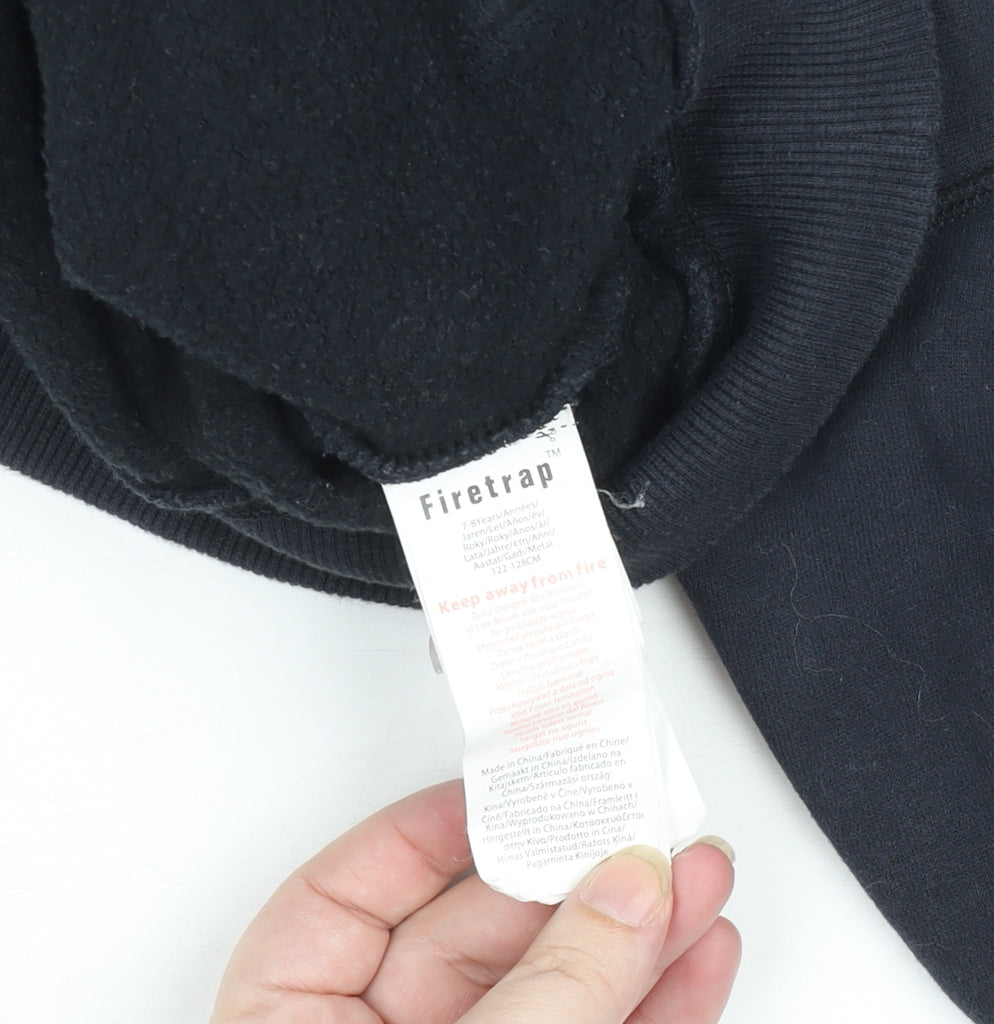 Upgrade your little one’s casual wardrobe with this stylish Firetrap Boys Pullover Hoodie in classic black. Crafted from a comfortable cotton and polyester blend, this hoodie offers a soft fleece feel on the inside for warmth and comfort during the cooler months. Designed for everyday wear, it combines practicality with effortless streetwear appeal. The hoodie features a bold Firetrap logo print across the chest, adding a trendy and authentic brand touch. The pullover style ensures easy wear, while the ribbed cuffs and hem provide a snug and comfortable fit. A roomy hood and a front kangaroo pocket make it perfect for layering and for keeping hands warm on chilly days. Sized for ages 7–8 years, this piece is ideal for school, weekend adventures, or lounging at home. The durable material blend of 80% cotton and 20% polyester makes it easy to care for and long-lasting wash after wash. Despite some gentle wear and slight fading on the logo, the hoodie remains in very good condition with no stains, holes, or damage found. This Firetrap hoodie is a must-have for boys who love a mix of comfort and cool, casual styling that works across autumn, winter, and spring. The versatile black colour means it pairs well with jeans, joggers, or shorts, making it a flexible and practical wardrobe essential that can handle active play and relaxed days alike. Grab this stylish hoodie today and keep your child warm while showcasing their effortless sense of style.