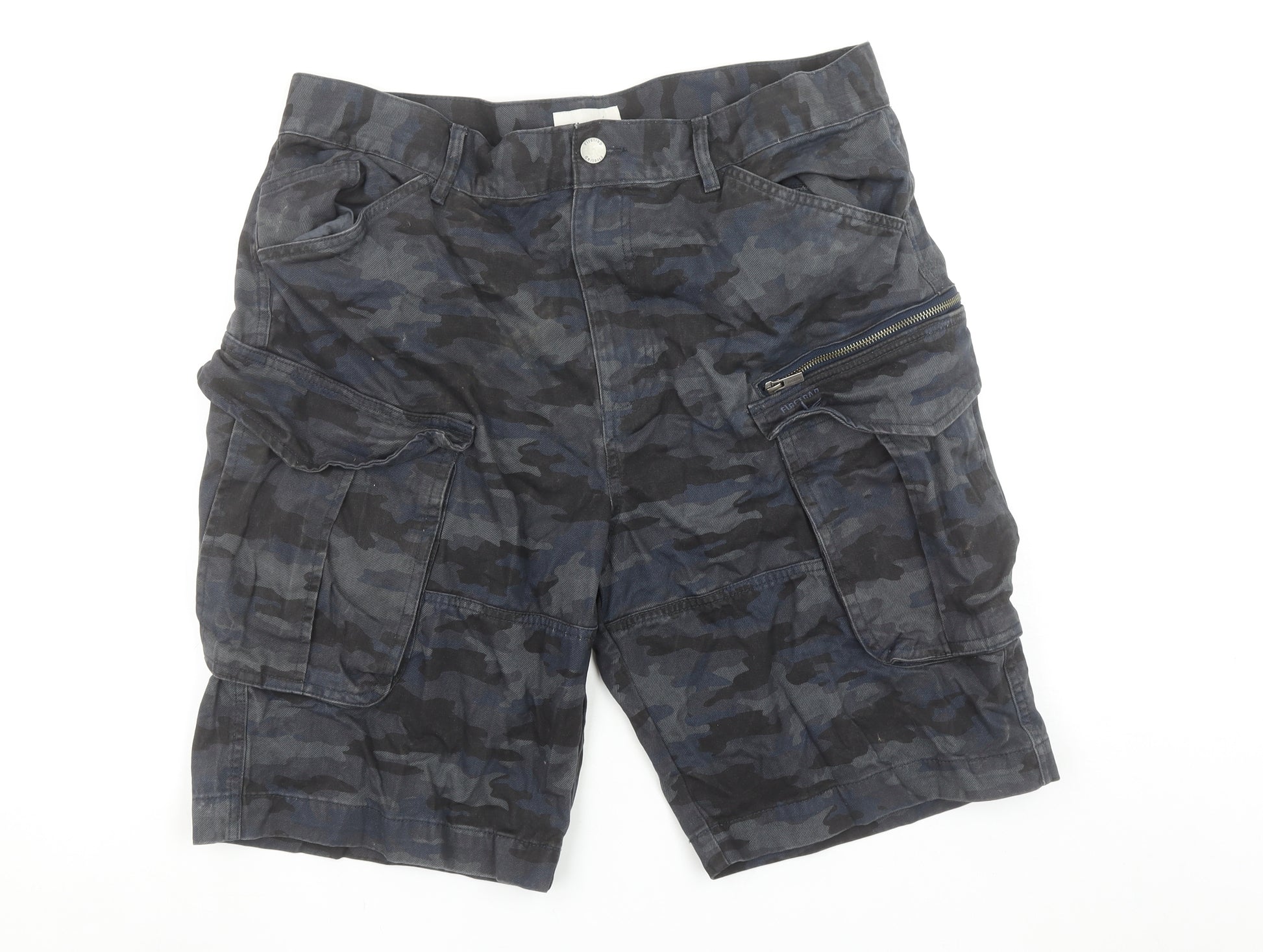 Step out in rugged comfort and style with these Firetrap Men's Cargo Shorts in blue camouflage. Crafted from 100% pure cotton, these shorts offer a comfortable, breathable fit ideal for everyday wear, travel, or outdoor activities. The tough canvas fabric provides durability, while the regular fit ensures ease of movement. Designed with practicality in mind, these cargo shorts feature multiple functional pockets, including deep side cargo pockets, a secure zip pocket, and traditional front and back pockets to keep your essentials within easy reach. The button and zip fastening provides a secure, classic closure, complemented by belt loops for an adjustable fit with your favourite belt. The blue camouflage pattern lends a versatile yet striking look, perfectly suited for casual days, barbeques, or holiday adventures. Ideal for pairing with plain tees or lightweight shirts, they can easily become your go-to piece for laid-back style. Firetrap is known for combining rugged design with street-ready fashion, and these shorts embody that ethos perfectly. Whether you’re exploring the outdoors or simply relaxing in style, they deliver reliable comfort with a modern edge. The machine washable cotton fabric makes for easy care, ensuring they stay fresh and ready for your next outing. With light signs of use but in excellent overall condition, these Firetrap Cargo Shorts provide exceptional value. A perfect wardrobe essential for modern men seeking quality, style, and comfort in one. Size 2XL caters well to those preferring a relaxed fit, while the dark camouflage print adds a bold yet wearable touch for any season. Ideal for spring and summer wear, these shorts are the perfect blend of utility and effortless cool. Upgrade your weekend look with these Firetrap blue camo cargo shorts — durable, versatile, and stylish.