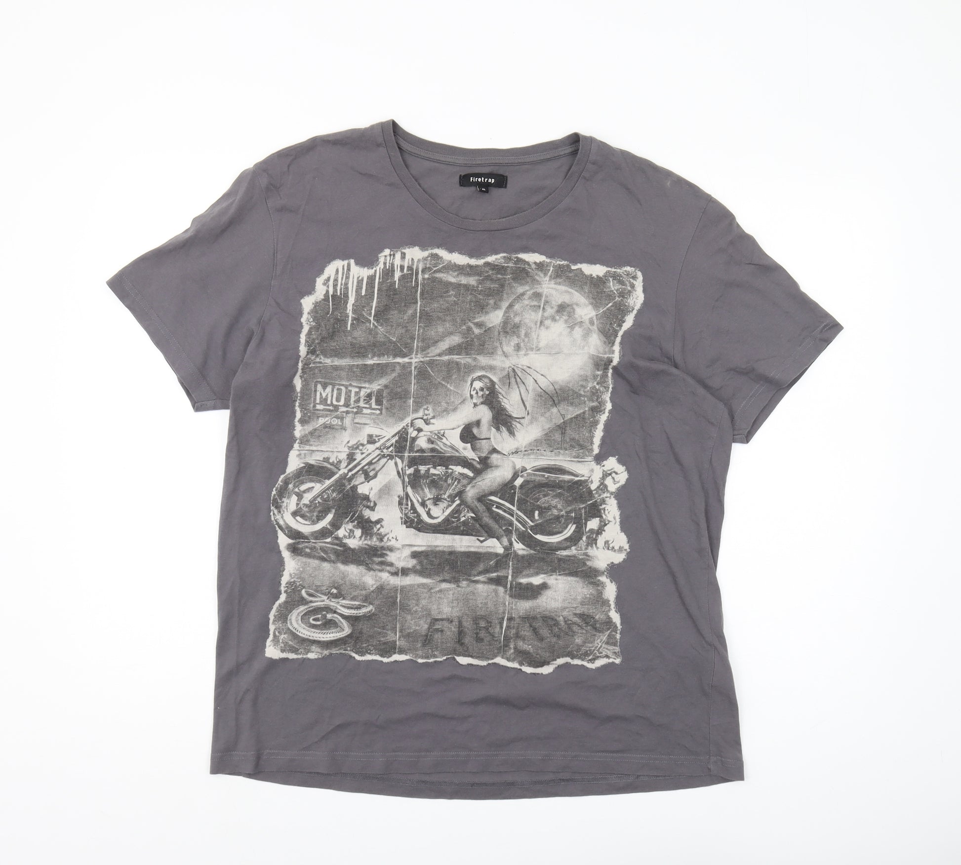 Kickstart your style with this Firetrap Men's T-Shirt, a perfect blend of casual comfort and edgy design. Crafted from 100% cotton, this grey tee ensures a soft feel and breathability, making it a staple for any wardrobe. Its regular fit and crew neck provide a classic silhouette that suits various occasions. The short sleeves add a touch of laid-back style, making it ideal for warm weather or layering. The standout feature of this unique piece is the striking motorcycle-themed graphic print, which adds a bold and dynamic edge to the simple grey background. Accentuated with artistic detail, this design makes the t-shirt not just apparel, but a statement piece. It's perfect for motorcycle enthusiasts or anyone looking to add some character to their casual outfits. Suitable for men, teens, and unisex adults, this versatile shirt transcends conventional fashion boundaries. Though pre-loved, it's in excellent condition with no visible damage, reflecting its quality craftsmanship. Whether paired with jeans for a casual day out or shorts for a summer event, this t-shirt promises to enhance your look effortlessly. Machine washable for easy care, it'll remain a reliable favourite in your collection season after season.