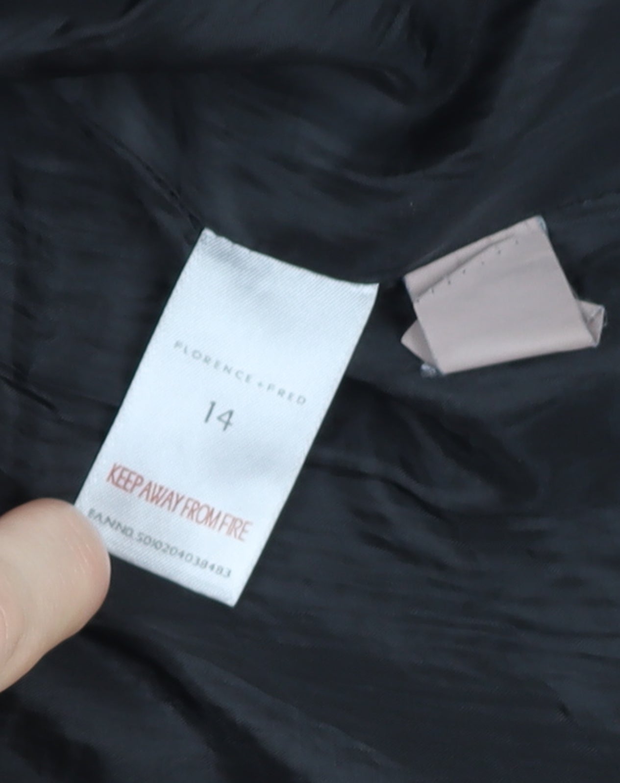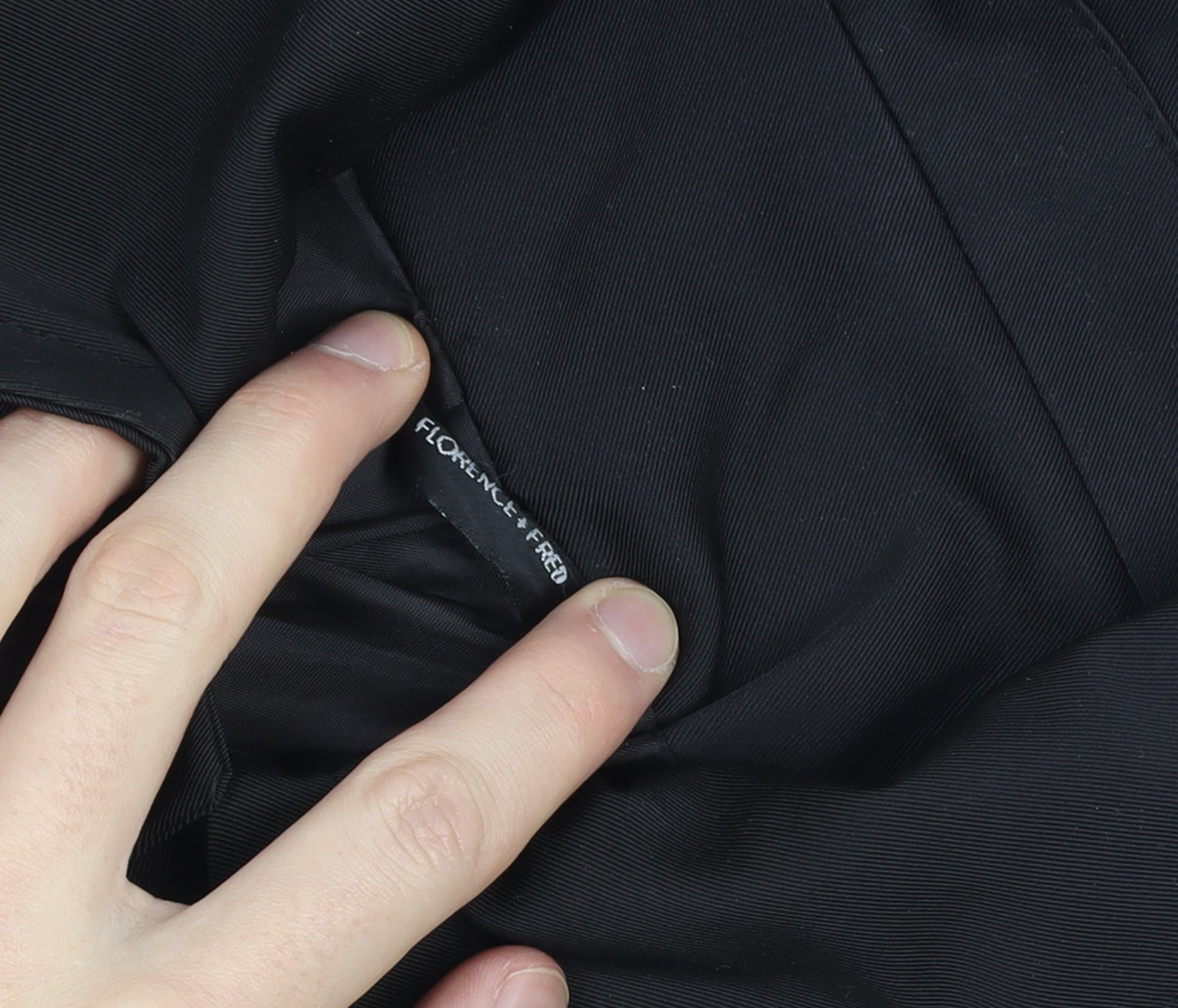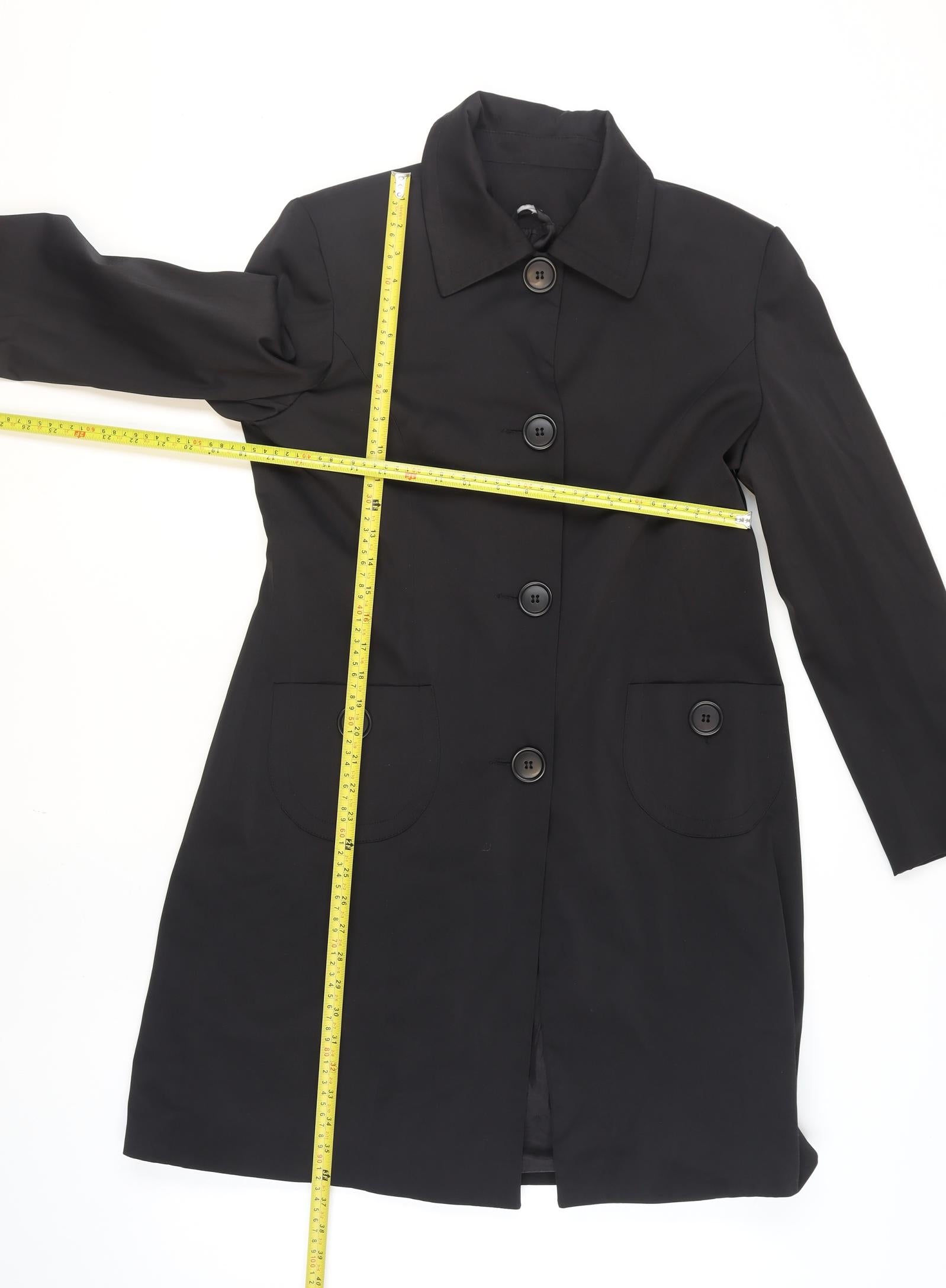 Step into timeless elegance with this classic black trench coat from Florence + Fred. Designed for the modern woman, this refined piece effortlessly balances simplicity with sophistication. Crafted from a durable blend of polyester, cotton and elastane, it offers a smooth and structured finish that retains shape while providing comfort and ease of movement. The coat features a full-length silhouette that delivers flattering coverage and a tailored look, perfect for layering during transitional seasons such as autumn and spring. Its design includes a notched collar, single-breasted front with large statement buttons, and two front patch pockets that combine practicality with understated style. The fully lined polyester interior ensures a smooth fit over your outfit, enhancing comfort and polish whether worn over business attire, casual jeans, or an evening ensemble. The trench-inspired style makes it an excellent addition to any wardrobe for work, travel, or leisure. The coat’s minimalist aesthetic and high-quality finish make it versatile for both smart and casual occasions. In excellent pre-loved condition, it shows only minimal signs of previous wear, maintaining its original structure and charm. Pair it with a chic scarf and boots for cool days or layer over tailored trousers for an effortlessly put-together look. Florence + Fred’s reputation for affordable elegance ensures this timeless piece will remain a wardrobe staple for seasons to come. This fantastic black long coat is ideal for anyone seeking sleek, practical style with feminine sophistication at an exceptional value.