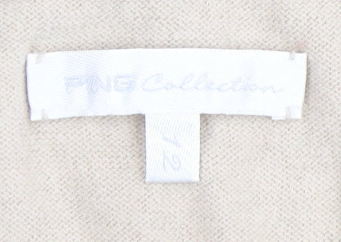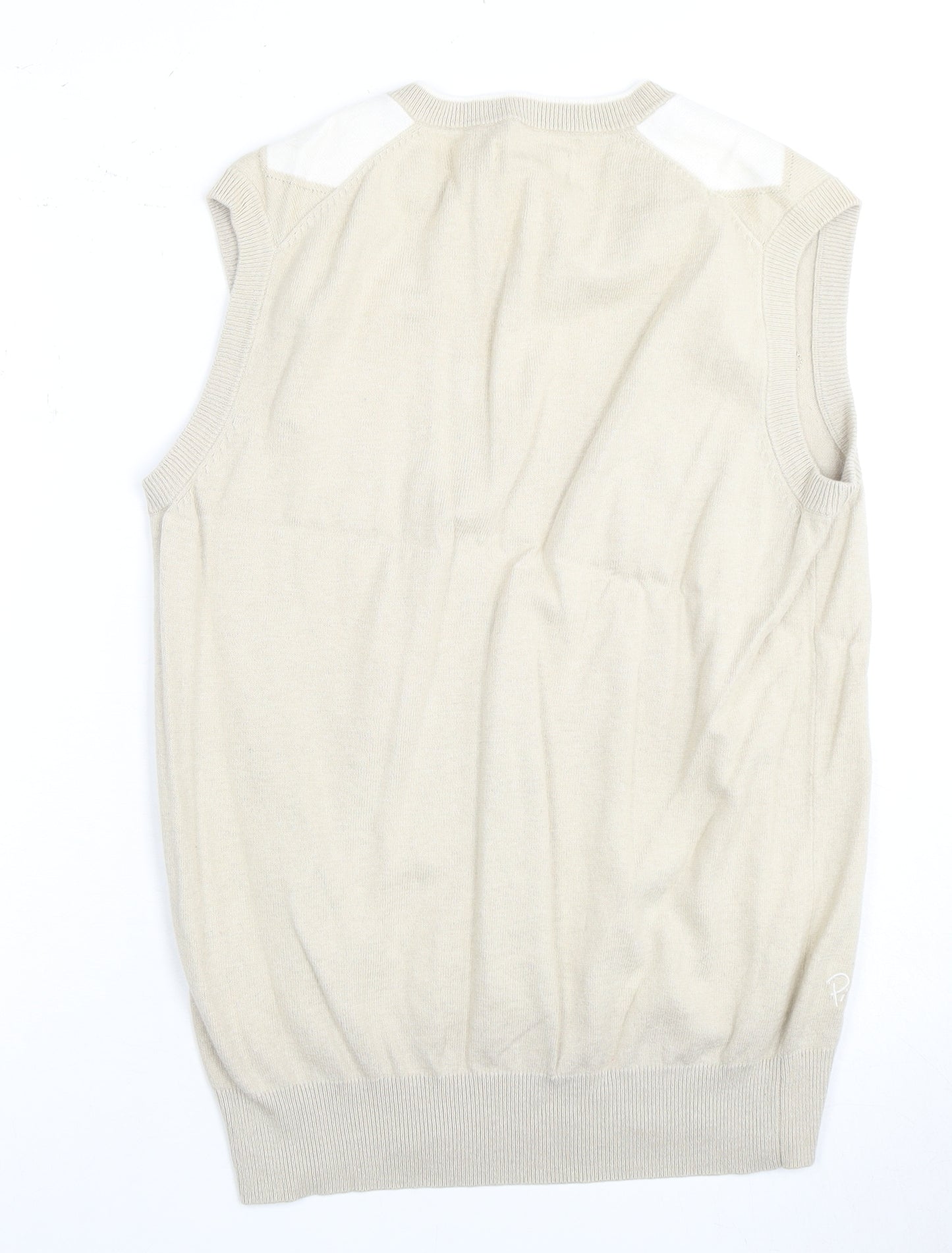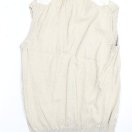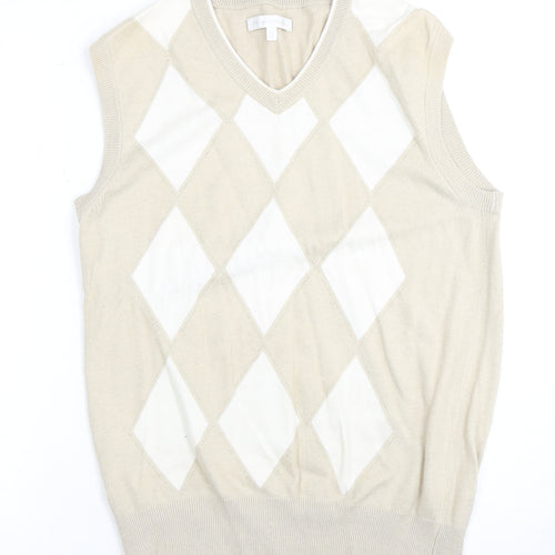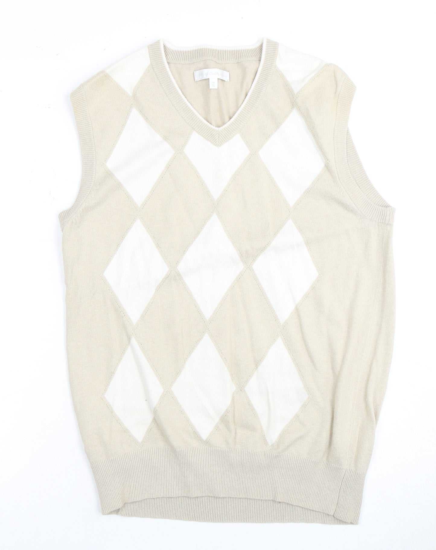 This stylish beige vest from FNG Collection is a perfect blend of comfort and elegance, ideal for casual outings. Crafted from 100% cotton, the knit fabric ensures breathability while maintaining a sophisticated look with its classic argyle pattern. The V-neckline adds a touch of femininity, making it versatile for layering over shirts or wearing alone in warmer weather. The sleeveless design enhances ease of movement, offering a relaxed fit for all-day wear. This women's jumper, in a size 14, is a timeless addition to your wardrobe, suitable for year-round styling. No signs of wear enhance its appeal, ensuring satisfaction with every purchase.