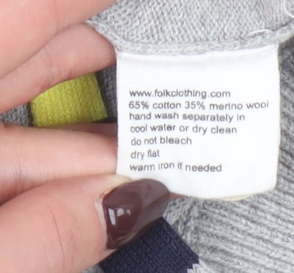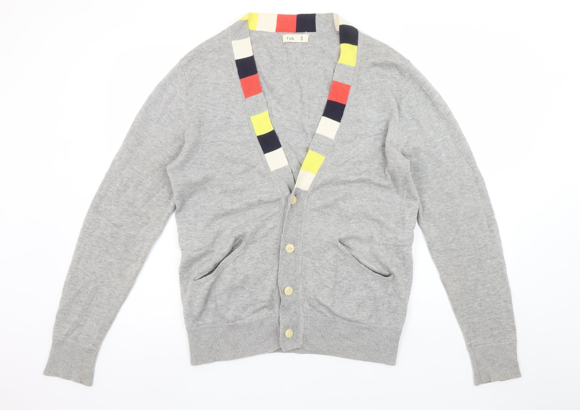 This Folk men's cardigan combines modern British design with easy comfort and distinctive details. Crafted from a quality blend of 65% cotton and 35% merino wool, it offers a soft, breathable feel with a refined knit structure that makes it suitable for layering in transitional weather. The mid-grey tone of the cardigan provides a neutral base, while the bold colour-block striping around the neckline — featuring shades of navy, red, yellow, and white — delivers a striking and contemporary edge that elevates casual styling. Structured with a V-neckline and button front fastening, this cardigan presents a traditionally classic silhouette reinterpreted with Folk’s minimalist aesthetic. The front is completed with two discreet pockets for practicality, and ribbed cuffs and hem give the garment a tailored finish that ensures shape retention and a comfortable fit. Lightweight yet warm, it’s an ideal choice for cool spring mornings and crisp autumn evenings, offering versatile wear both at home and out. The cotton and merino wool combination ensures durability and breathability, while providing natural temperature control and a soft hand feel. This piece is in very good pre-owned condition, showing light general wear with a small mark at the cuff but retaining its shape and colour beautifully. A regular fit, marked size 3 (equivalent to UK Men’s Medium), provides a flattering drape that works well layered over shirts, tees, or fine knitwear. Perfect for men looking to add understated sophistication to casual outfits, the Folk cardigan harmonises with chinos, jeans, or smart cotton trousers effortlessly. Ideal for casual and smart-casual occasions, this premium lightweight cardigan balances relaxed comfort and elevated style for everyday wear. Sophisticated, timeless, and distinctive — a reliable wardrobe staple that reflects Folk’s commitment to modern craftsmanship.