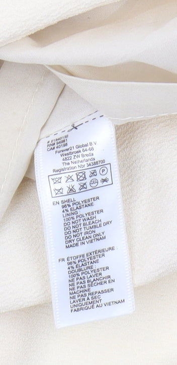 Elevate your wardrobe with this chic Forever 21 Women's Ivory Wrap Short Skirt. Perfect for any fashion-forward individual, this skirt features a stunning wrap design that adds a touch of elegance to any outfit. Made from a high-quality polyester and elastane blend, it offers both comfort and style for everyday wear. Its short length makes it ideal for warm weather outings or an evening out with friends. This versatile piece, in a classic ivory colour, can easily be paired with a variety of tops and accessories, making it a must-have addition to your fashion collection. Whether you're dressing up for a special occasion or going for a casual look, this skirt fits the bill. Despite being gently used, it’s in excellent condition with no visible flaws, making it a smart choice for budget-conscious fashionistas. Secure it today for just £15.00 and step out in style.
