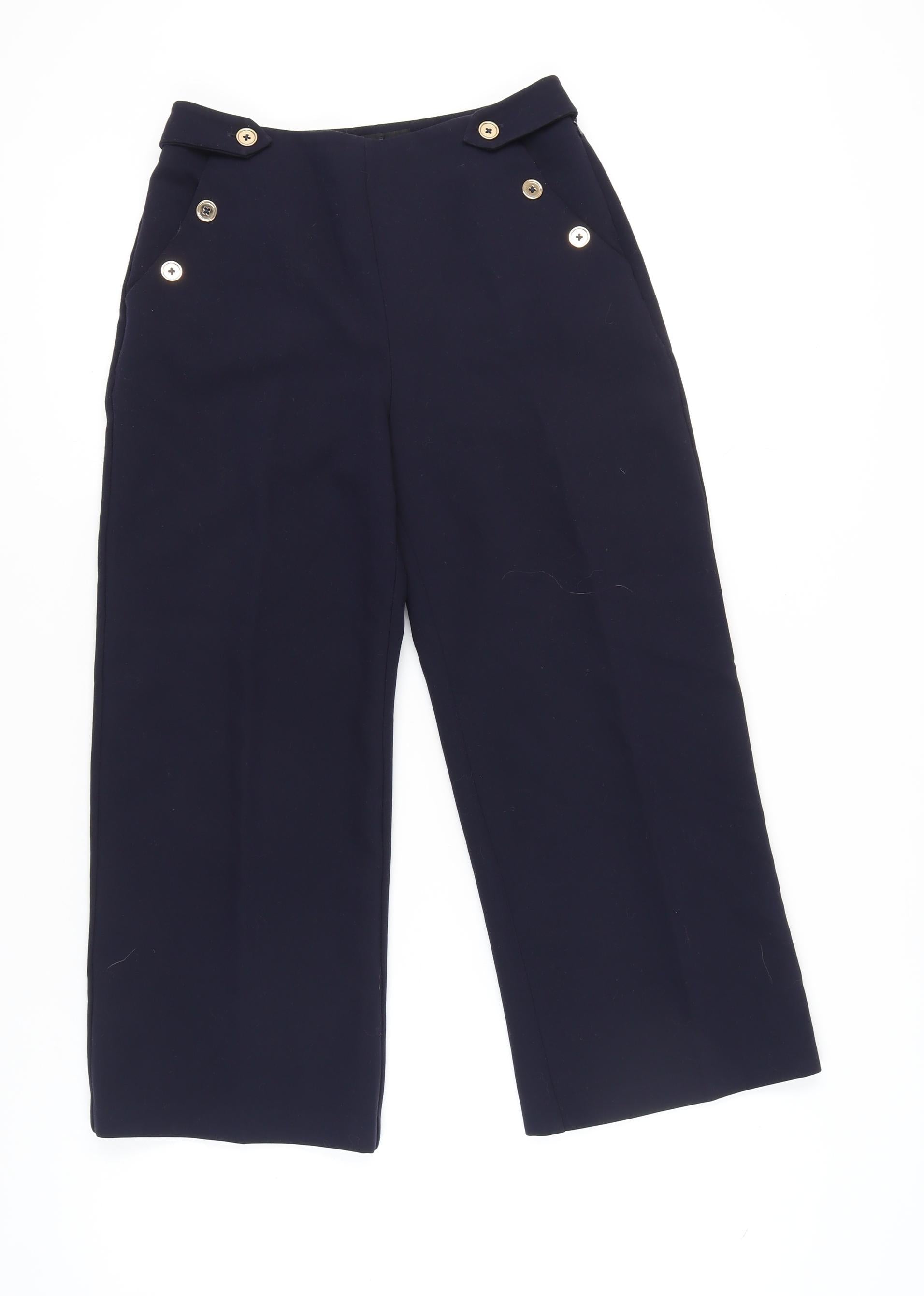 Enhance your wardrobe with these elegant trousers by Forever New, tailored for the modern woman. Crafted in a rich blue shade, these trousers are a staple for any casual occasion, promising both comfort and style. Constructed from a blend of 71% polyester, 22% viscose, and 7% elastane, they offer a wonderful combination of comfort, durability, and slight stretch for ease of movement. The trousers feature a mid-rise fit with a straight leg style, allowing for a flattering silhouette. Practical design elements include button accents and functional pockets, adding chic simplicity and utility. Consider these an ideal pick for winter wear, with a regular fit suitable for a variety of settings, such as casual outings or relaxed office days. The flat front design ensures a sleek appearance, while the machine-washable fabric guarantees easy maintenance. Available in size 8, with an approximate inside leg measurement of 28 inches and a waist size of 27 inches, these trousers promise a comfortable fit. Offering a classic, no-pattern style, they are versatile enough to be paired effortlessly with a range of tops and accessories. Excellent condition with some visible light fabric wear, they are priced competitively, ensuring value for both style and budget. Embrace the effortless sophistication with these essential trousers from Forever New.