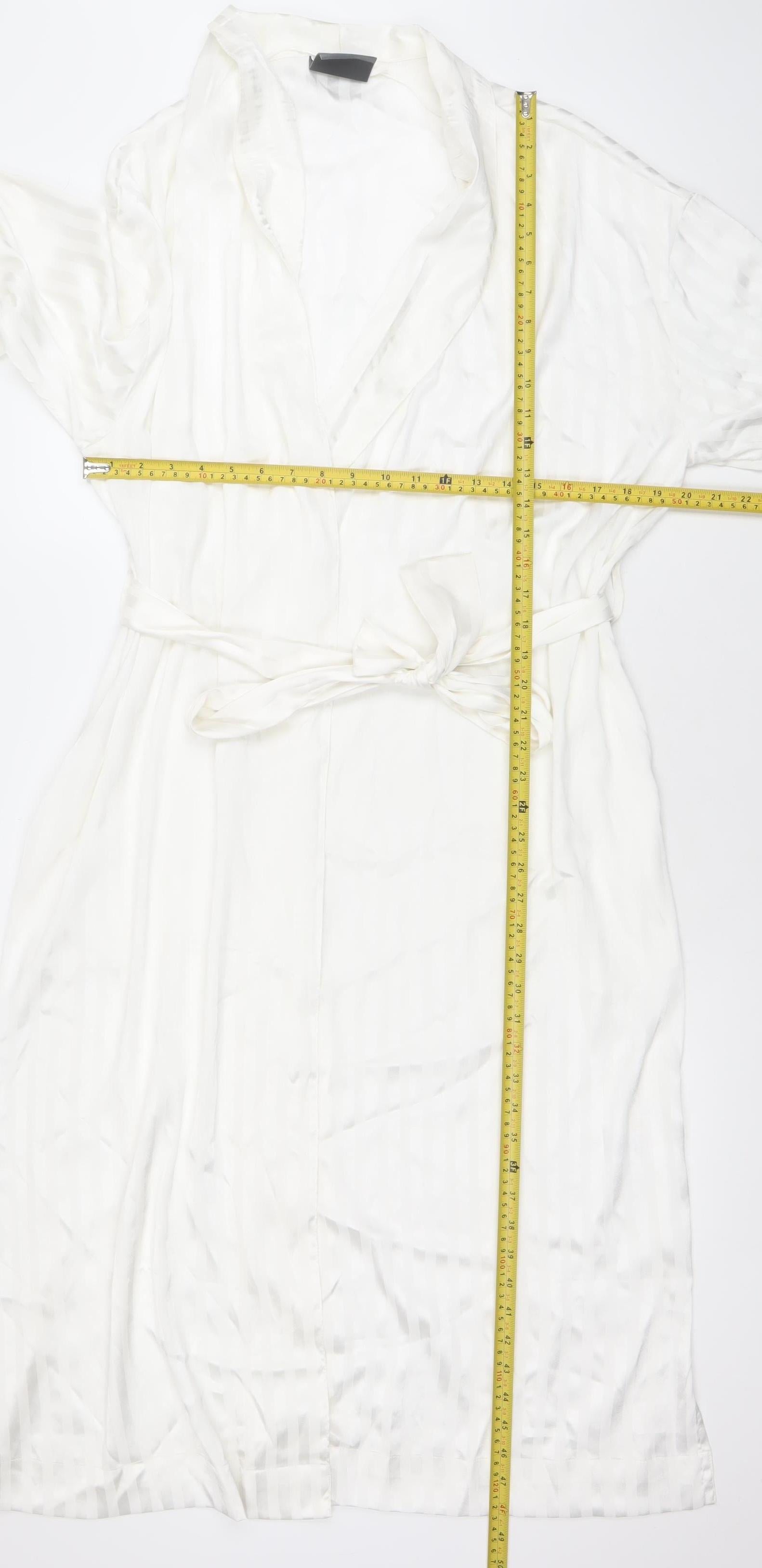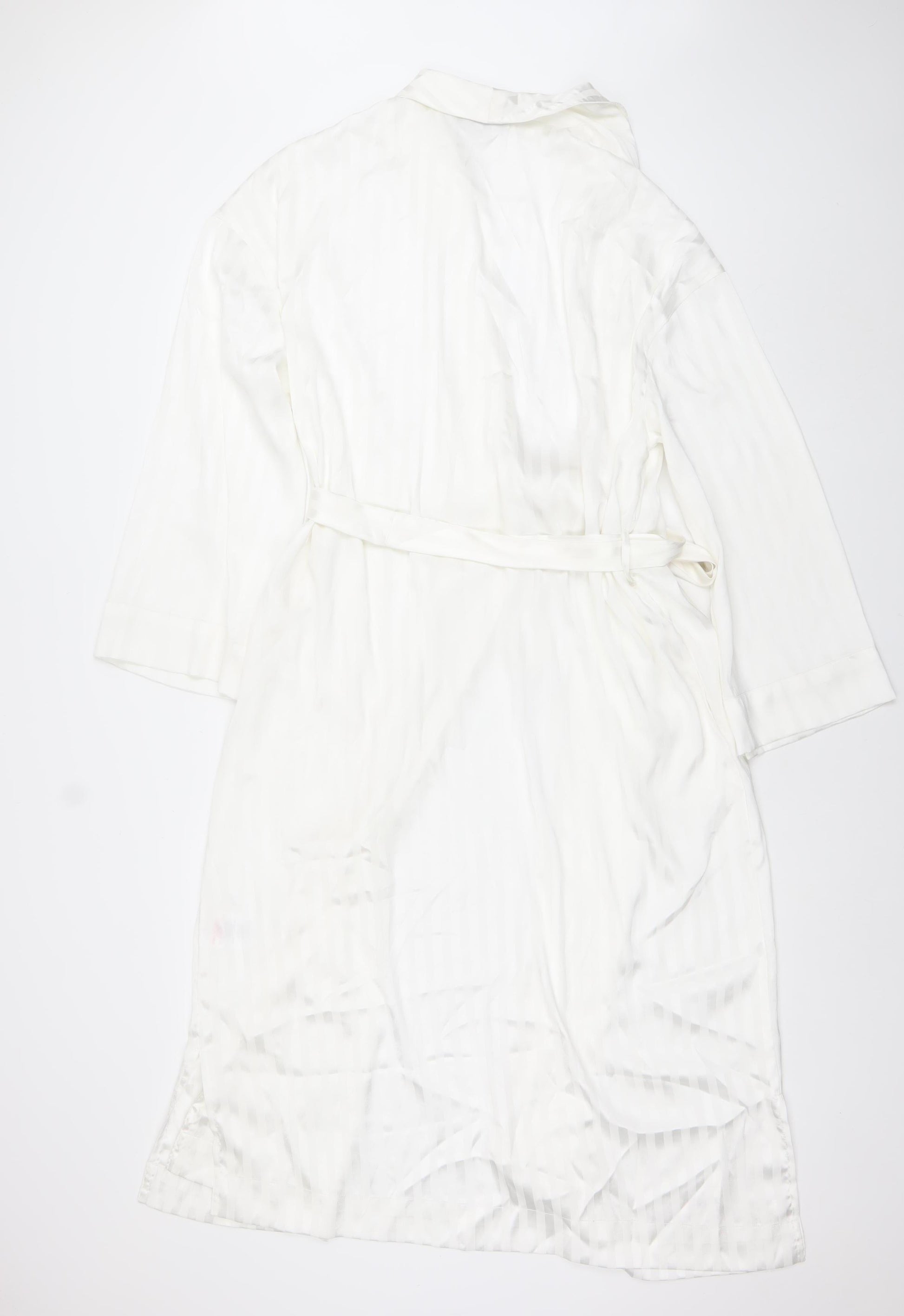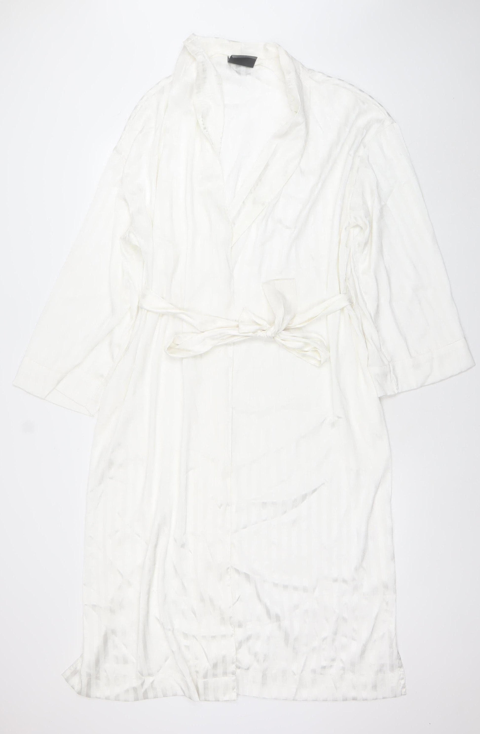 Indulge in elegant comfort with this Francis Brenman Women's White Satin Kimono Robe, designed to add a touch of luxury to your nightwear collection. Crafted from beautifully soft 100% polyester satin, this robe has a smooth, lustrous finish that feels effortlessly gentle against your skin. The lightweight fabric drapes gracefully, offering both comfort and sophistication, ideal for lounging at home or layering over your nightgown. The white hue creates a timeless and refined look, suitable for any season, particularly spring and summer when lighter fabrics are essential. Designed with a flattering V-neckline and 3/4 length sleeves, this kimono-style robe combines ease of movement with stylish coverage. The included detachable tie belt allows you to adjust the fit to your preference, cinching the waist for a beautifully feminine silhouette. The solid colour and subtle sheen add a classic charm, while the belted accent further enhances its chic, minimalist aesthetic. Perfect for relaxing evenings, getting ready in style, or as a thoughtful gift, this robe embodies understated luxury and versatility. Its excellent condition ensures it remains a beautiful wardrobe addition, with only gentle signs of wear that do not detract from its appeal. Easy to care for, this robe is machine washable, making it both practical and stylish. Whether you’re winding down after a long day or starting your morning with a touch of elegance, the Francis Brenman White Satin Robe ensures you do it in comfort and class. A perfect choice for women seeking effortless sophistication in their sleepwear or loungewear ensemble.