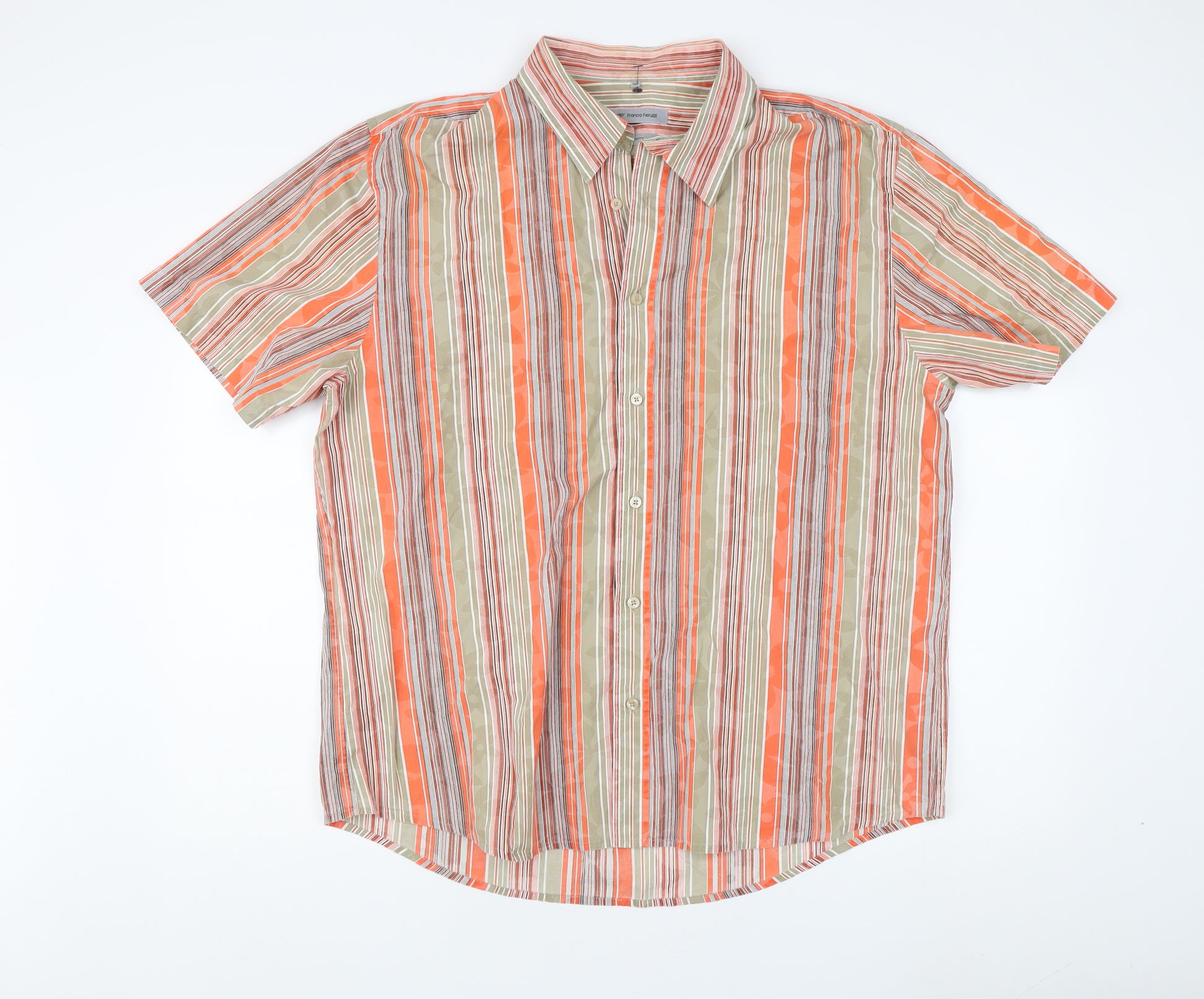 Enhance your casual wardrobe with this vibrant Franco Feruzzi men's shirt, designed to bring a pop of colour and style to any ensemble. Crafted from pure cotton, this comfortable and breathable shirt is perfect for the spring and summer seasons. The shirt features eye-catching stripes in a multicoloured palette that includes warm hues of orange, beige, and white, offering a versatile look suitable for various casual occasions.The regular fit and short sleeves make it an ideal choice for a relaxed day out or a laid-back gathering, ensuring both comfort and style. Its button-up design with button-down collar adds a touch of classic elegance, while the durable cotton fabric ensures easy care, making it machine washable for your convenience.Whether you're heading for a casual outing or enjoying a leisurely weekend, this striped shirt provides a fresh yet timeless look. Pair it with your favourite jeans or chinos to complete an effortless look that's both stylish and practical. The Franco Feruzzi shirt is an excellent addition for those who appreciate quality fashion at an affordable price. With its excellent condition and no visible defects, this piece promises to be a reliable staple for your wardrobe.