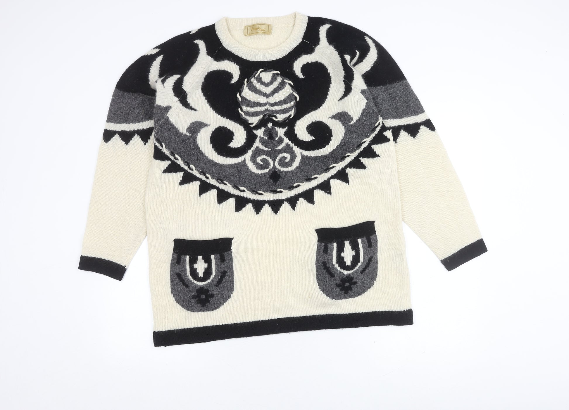 Embrace the winter warmth with this exquisite Frank Saut Women's Ivory Pullover Jumper. Designed with a captivating geometric pattern, this elegant piece stands out with its subtle embroidered details, making it a perfect choice for casual outings. Tailored from a luxuriously soft blend of lambswool, angora, and nylon, it ensures both warmth and style during the chilly winter and autumn months. This jumper features a comfortable crew neck and long, raglan sleeves, offering a relaxed fit for any occasion. Despite being a vintage piece, it retains its charm and elegance, showing only slight wear without any tags attached. Adorned with practical pockets, it's as functional as it is fashionable. Ideal for those looking to add a touch of sophistication to their casual wardrobe, this jumper promises to become a timeless staple in your collection.