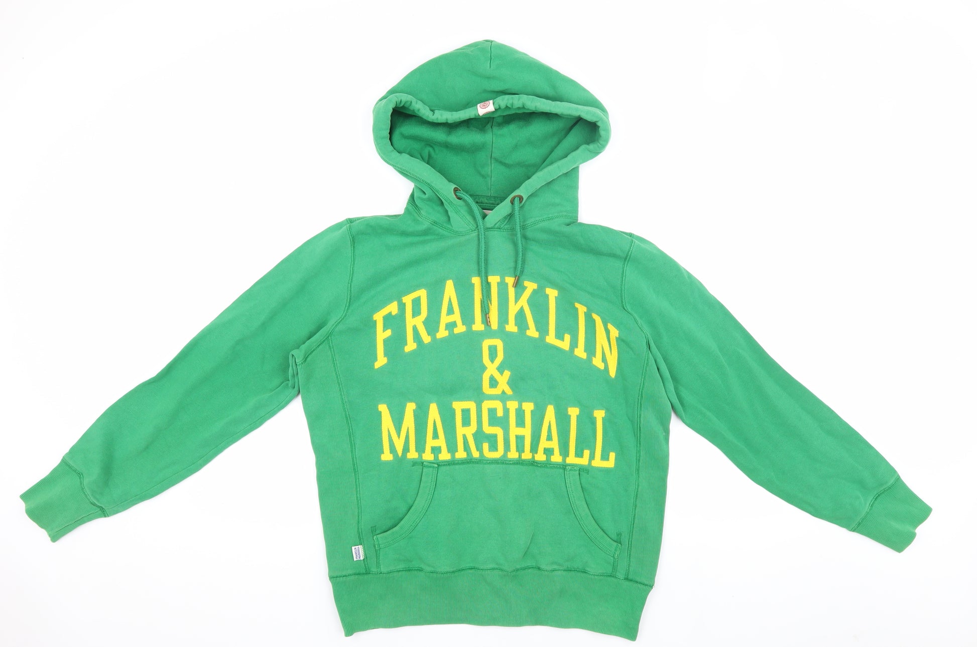 Introducing the Franklin & Marshall Green XS College Pullover Hoodie, a perfect blend of style and comfort for any wardrobe. This unisex hoodie flaunts a vibrant green hue, reflecting youthful energy and a fresh vibe. Adorned with a bold logo accent, the hoodie embodies a distinct college theme, making it an ideal choice for casual outings or university wear. Crafted from soft, warm fleece, it ensures comfort and cosiness across seasons—perfect for autumn, spring, and winter. Featuring a comfortable hood and drawstring closure, it promises ease and adjustability, while the kangaroo pocket adds practicality, enhancing its casual appeal. Made from a durable blend of 80% cotton and 20% polyester, it promises longevity and retains a brand new feel with machine-washable convenience. Tailored with a regular fit, it suits a variety of body types, ensuring style without compromising comfort. The hoodie’s graphic print design adds a fashionable edge, making it a versatile piece for any casual occasion. Whether you're heading to class, enjoying a laid-back weekend, or meeting friends, this Franklin & Marshall hoodie is your go-to attire. Experience quality, style, and comfort in one package with this prominent piece from a renowned brand. Ready to elevate your everyday look? Don’t miss out on this essential addition to your casual collection.