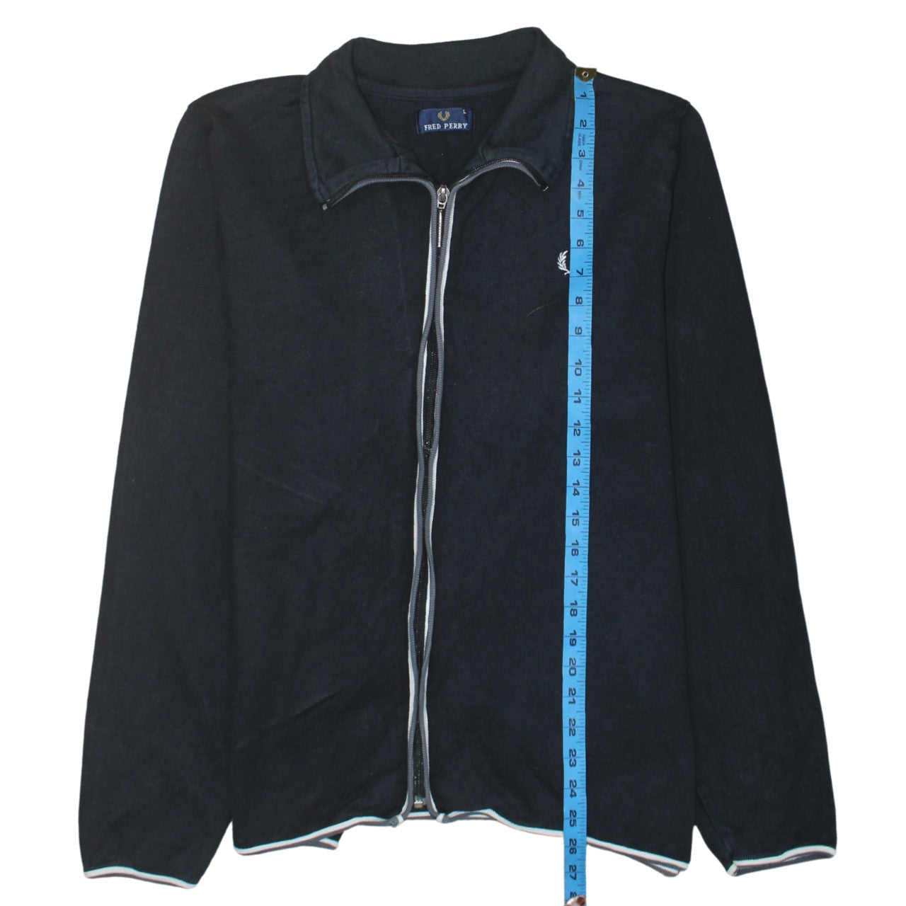 This Fred Perry men's full zip sweatshirt offers timeless British sportswear style with a sleek, minimalist design. Crafted from soft and breathable black cotton jersey, it features the brand’s iconic laurel wreath logo embroidered on the chest, a symbol of classic sophistication. The collared neckline adds a touch of refinement, while the silver full-length zip provides practicality and versatility. Designed with long sleeves and subtle contrast trims along the hem and zip line, this piece embodies understated style and modern comfort. Perfect for layering through the cooler months of autumn, spring, and winter, the sweatshirt can easily be dressed up or down – wear it with jeans and trainers for a casual look or layer over a shirt for a more polished finish. The regular fit ensures comfortable wear without being too loose, making it ideal for everyday use. Lightweight and machine washable, it’s a practical yet stylish addition to your wardrobe. Whether for casual days, travel, or an evening out, this Fred Perry sweatshirt captures effortless elegance and versatility, making it a must-have for men who value quality and classic design. The garment is in very good pre-owned condition with minimal signs of wear, no stains or damage present, ensuring plenty of life left in this quality piece. Add it to your rotation for a sophisticated touch to casualwear – an authentic Fred Perry staple designed for timeless appeal.