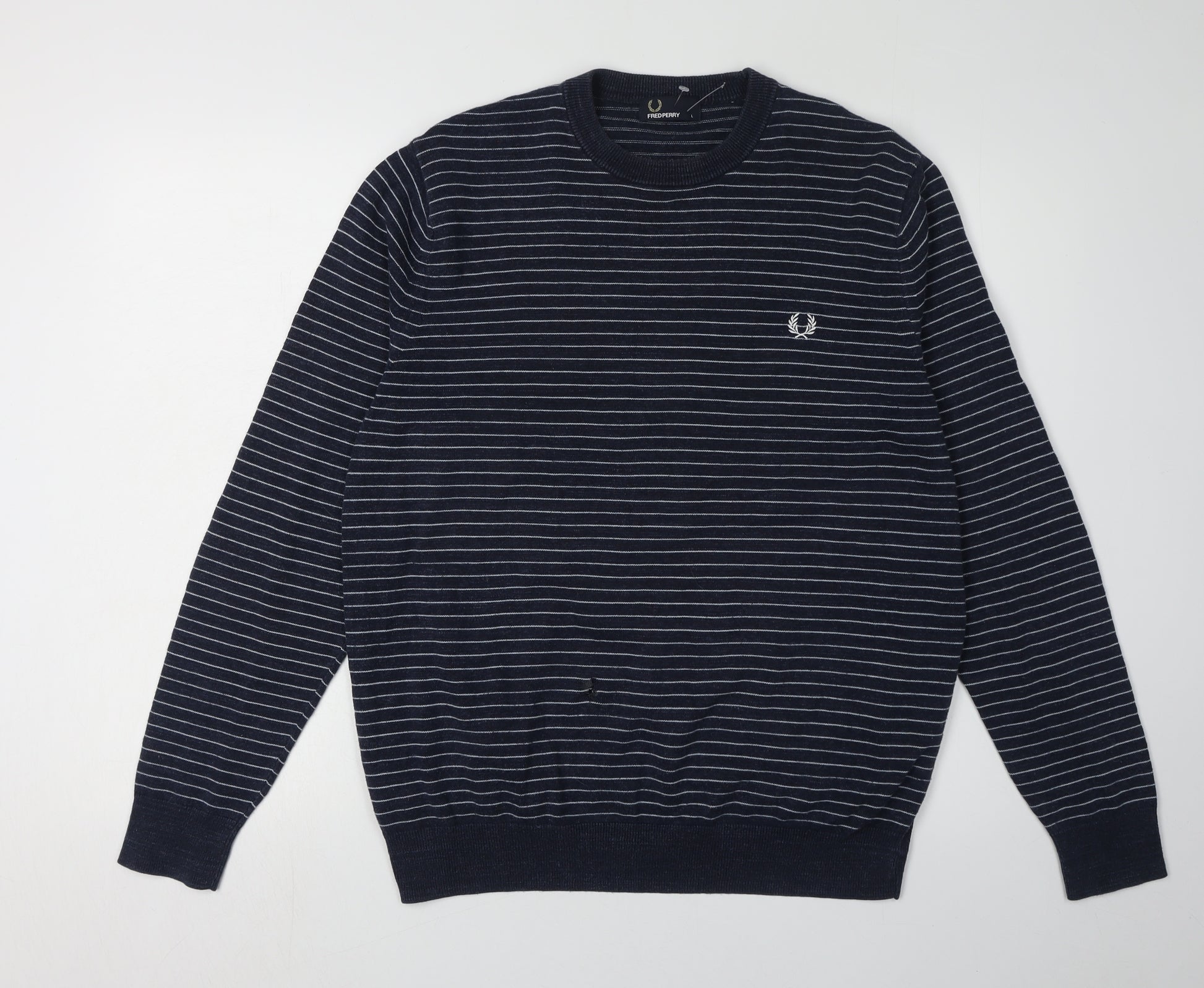 Elevate your wardrobe with this Fred Perry Men's Jumper, a perfect blend of classic style and modern design. Crafted from 100% cotton, this knit pullover ensures exceptional comfort and warmth, making it ideal for the autumn and winter seasons. The rich blue hue adorned with subtle stripes and the iconic Fred Perry logo exudes timeless sophistication and a relaxed vibe. Perfect for casual occasions, this regular fit jumper features a crew neck and long sleeves, offering versatility and a flattering silhouette for everyday wear. The durable fabric is machine washable, making it easy to maintain and keep looking fresh. Despite a small hole on the front, the jumper remains a great addition to any man's wardrobe—ideal for layering over shirts or under jackets on cooler days. Whether you're dressing for a casual day out or a chic evening gathering, this Fred Perry jumper will undoubtedly enhance your style and confidence.
