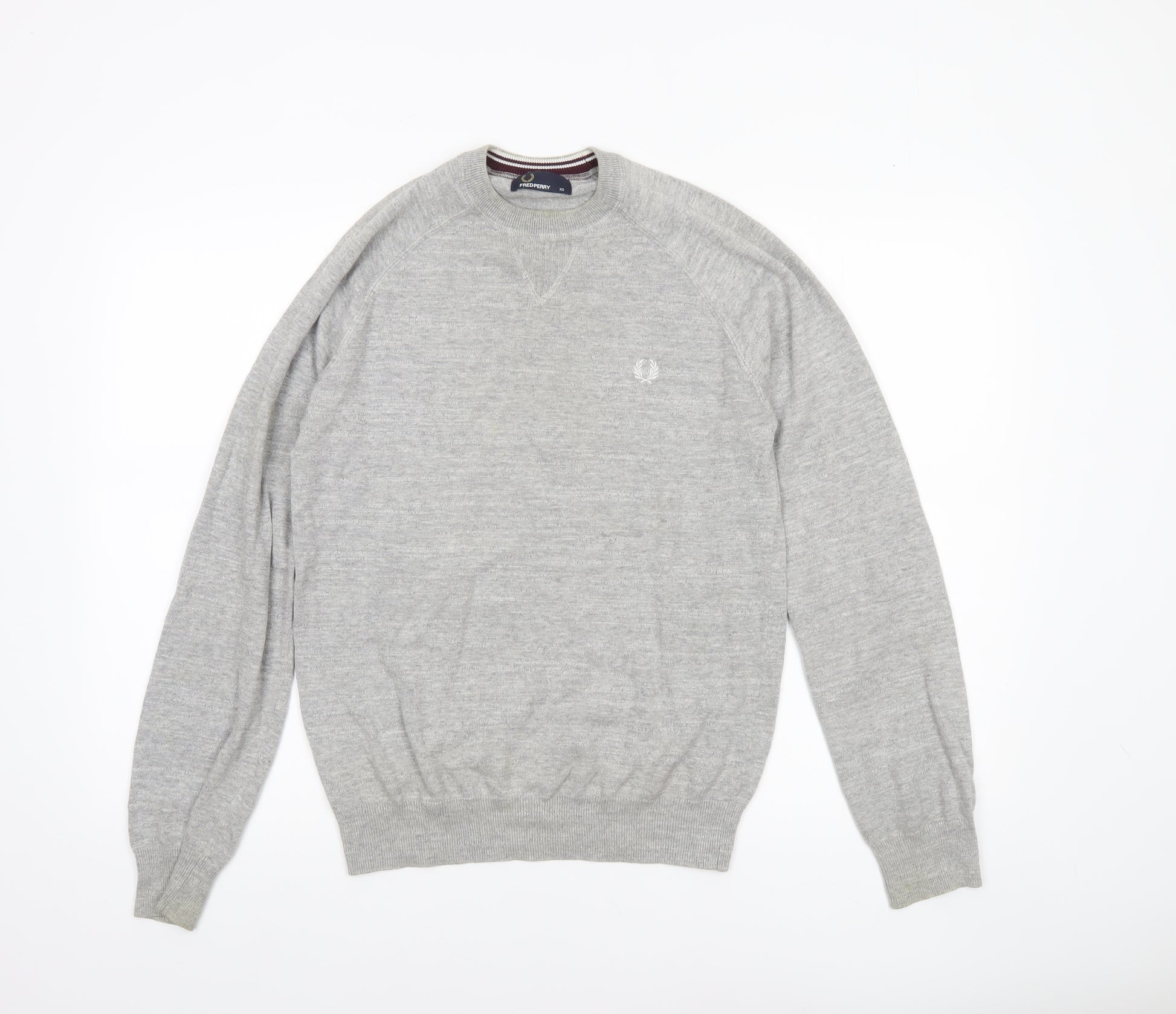 Elevate your wardrobe with this timeless Fred Perry men's crew neck jumper in a versatile light grey hue. Crafted from 100% pure wool, this piece delivers both warmth and breathability, ideal for cooler days during autumn and winter. The fine tight-knit construction gives it a smooth, lightweight feel while maintaining the brand’s signature premium quality. Perfect for layering or wearing on its own, the jumper provides a classic fit that complements various body shapes.The crew neckline and ribbed cuffs and hem ensure a snug yet comfortable fit, while the embroidered Fred Perry laurel wreath logo on the chest adds a subtle but unmistakable designer touch. This jumper effortlessly bridges the gap between smart and casual, making it a great choice for everyday wear, office outfits, or weekend relaxation.Pair it with chinos for a polished workwear look or with jeans for a relaxed, casual outfit. The breathable pure wool fabric helps regulate body temperature, ensuring comfort indoors or outdoors. Carefully machine washable for convenience, it retains its softness and quality with proper care.This Fred Perry jumper is in excellent pre-owned condition, showing minimal signs of wear and maintaining superb fabric integrity. Its understated grey tone makes it easy to coordinate with a wide range of colours and styles — a true wardrobe essential for the discerning man. If you're seeking a stylish, authentic piece that offers both comfort and timeless appeal, this Fred Perry wool pullover is a must-have addition to your collection.