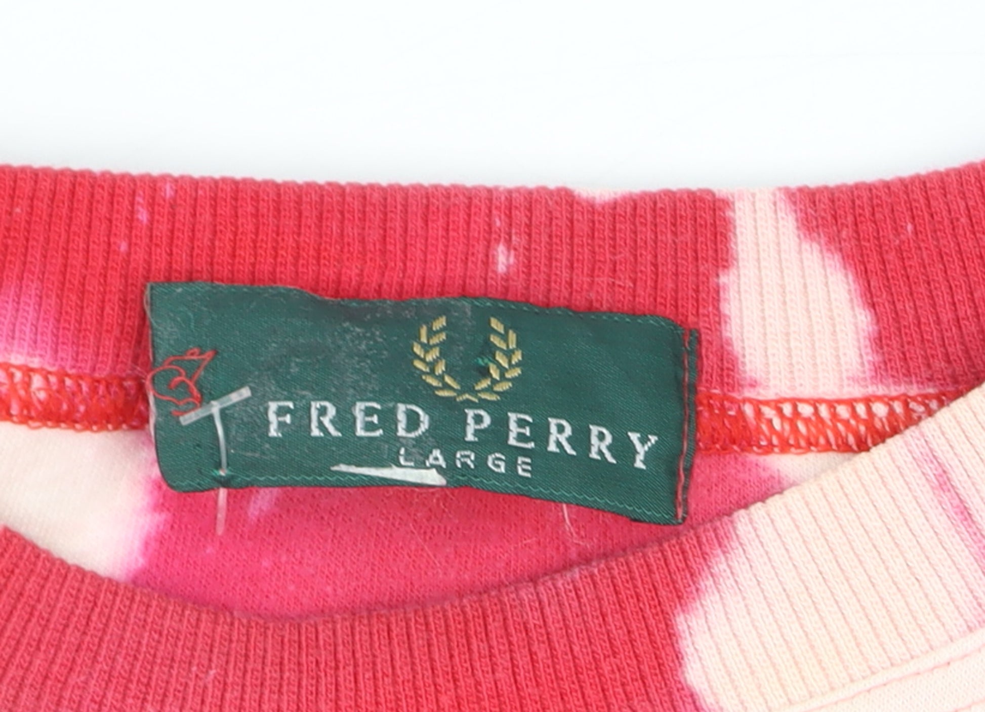 This Fred Perry men's sweatshirt offers a distinctive and eye-catching style with its vibrant multicoloured tie-dye effect in shades of red, pink, and cream. Crafted from 100% soft cotton, it delivers a comfortable feel that is perfect for everyday wear. The sweatshirt features a crew neckline, long sleeves, and ribbed cuffs and hem for a classic look that maintains its shape. The renowned Fred Perry laurel wreath logo embroidered on the chest adds a touch of the brand’s heritage and authenticity. Designed in a regular fit, this pullover sweatshirt is well-suited for layering during spring, autumn, or cooler winter days. Made in Germany, it reflects quality craftsmanship and timeless appeal. The lightweight yet durable cotton knit fabric ensures breathability and comfort across the seasons. With its unique tie-dye pattern, no two sweatshirts are exactly the same, making it a stylish statement piece for casual outfits. Pair it with jeans or chinos for a relaxed retro look. The sweatshirt is machine washable for ease of care. While the overall condition of the garment is excellent, there are slight hints of fading on the cuffs consistent with minimal prior wear. This item is ideal for vintage fashion lovers or Fred Perry enthusiasts who appreciate colourful and expressive clothing. Combining classic sportswear roots with artistic design, this sweatshirt effortlessly bridges sporty and streetwear styles. It’s both comfortable and versatile, making it an essential addition to any modern wardrobe. Add this distinctive Fred Perry sweatshirt to your collection for an instant lift to your casual look.