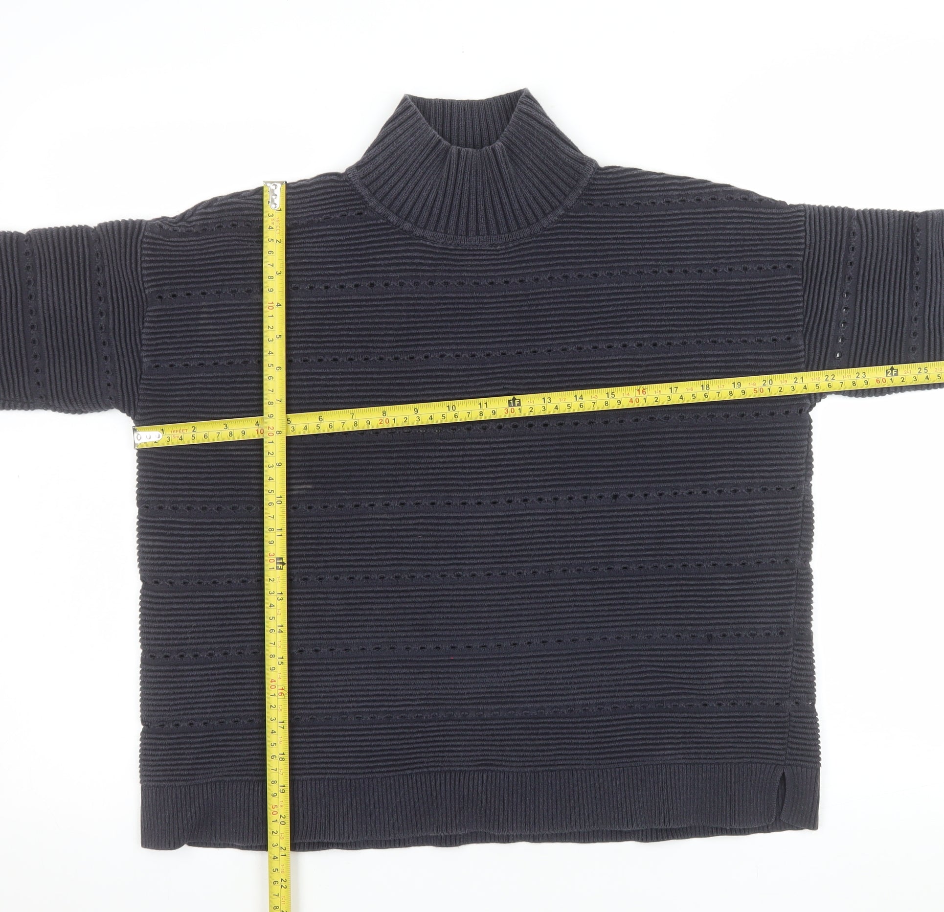 Stay effortlessly stylish through the cooler months with this French Connection men’s roll neck jumper. Crafted from a high-quality 100% cotton knit, this piece offers warmth, comfort, and durability in one versatile layer. The navy blue hue adds depth and sophistication to your wardrobe, making it a perfect match for jeans, chinos, or tailored trousers. Designed with a distinctive chunky ribbed pattern and subtle horizontal detailing, this jumper provides texture and standout appeal while keeping the overall look clean and modern. The soft roll neck enhances warmth while retaining an easygoing yet refined aesthetic, suitable for casual wear or smart layering. The heavyweight cotton ensures breathability and long-lasting comfort, making it ideal for autumn and winter wear. The long sleeves and ribbed cuffs help trap heat, ensuring you stay cosy during cold-weather outings without compromising on style. The jumper’s regular fit offers a classic silhouette that suits most body types, while the fine cotton knit ensures a comfortable drape. Although previously worn, it remains in very good condition with minor fade marks on the front that do not detract from its overall appearance. French Connection’s commitment to quality and timeless design is clear in the craftsmanship and construction of this piece. Easy to maintain and fully machine washable, this jumper promises both practicality and elegance. Whether you’re heading to a casual gathering, a weekend walk, or simply looking for a dependable layering piece for everyday wear, this French Connection roll neck jumper delivers understated sophistication and effortless comfort that works season after season.
