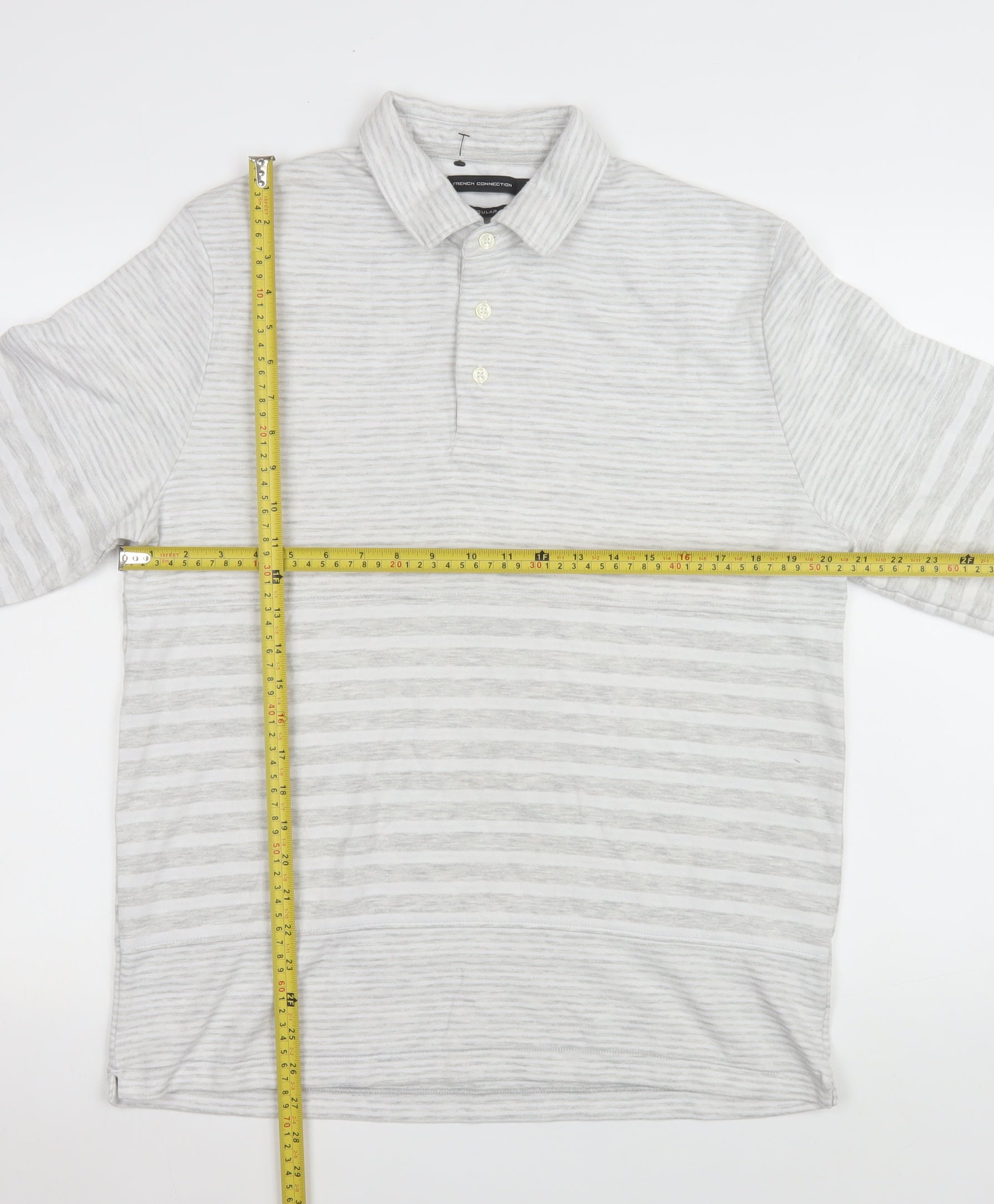 Upgrade your casual wardrobe with this stylish French Connection men's long sleeve polo shirt. Crafted from a comfortable blend of 60% cotton and 40% polyester, it offers softness and breathability while maintaining a lightweight feel for all-day comfort. The subtle grey striped pattern adds a modern twist to a timeless design, ideal for layering or wearing on its own through multiple seasons. The collared neckline with a button-up closure gives a classic, polished look suitable for casual outings, weekend wear, or smart casual occasions. Designed in a regular fit, this polo provides a relaxed yet structured silhouette that flatters most body types. The premium cotton-polyester mix ensures durability and shape retention, while being easy to care for with machine wash capability. Versatile and refined, this top is perfect for pairing with jeans or chinos for effortless off-duty style. With a chest width of approximately 55 cm and a shirt length of 75 cm, this polo fits comfortably without feeling restrictive. Ideal for spring through autumn wear, the neutral grey hue makes it easy to coordinate with a wide range of wardrobe options. In excellent pre-loved condition, this garment shows minimal signs of wear and remains in great shape overall, ready to complement any modern man’s collection. A fantastic, versatile piece from French Connection’s casualwear range, blending understated design with everyday practicality. Make this well-made wardrobe staple yours today and enjoy a smart look that never goes out of style.