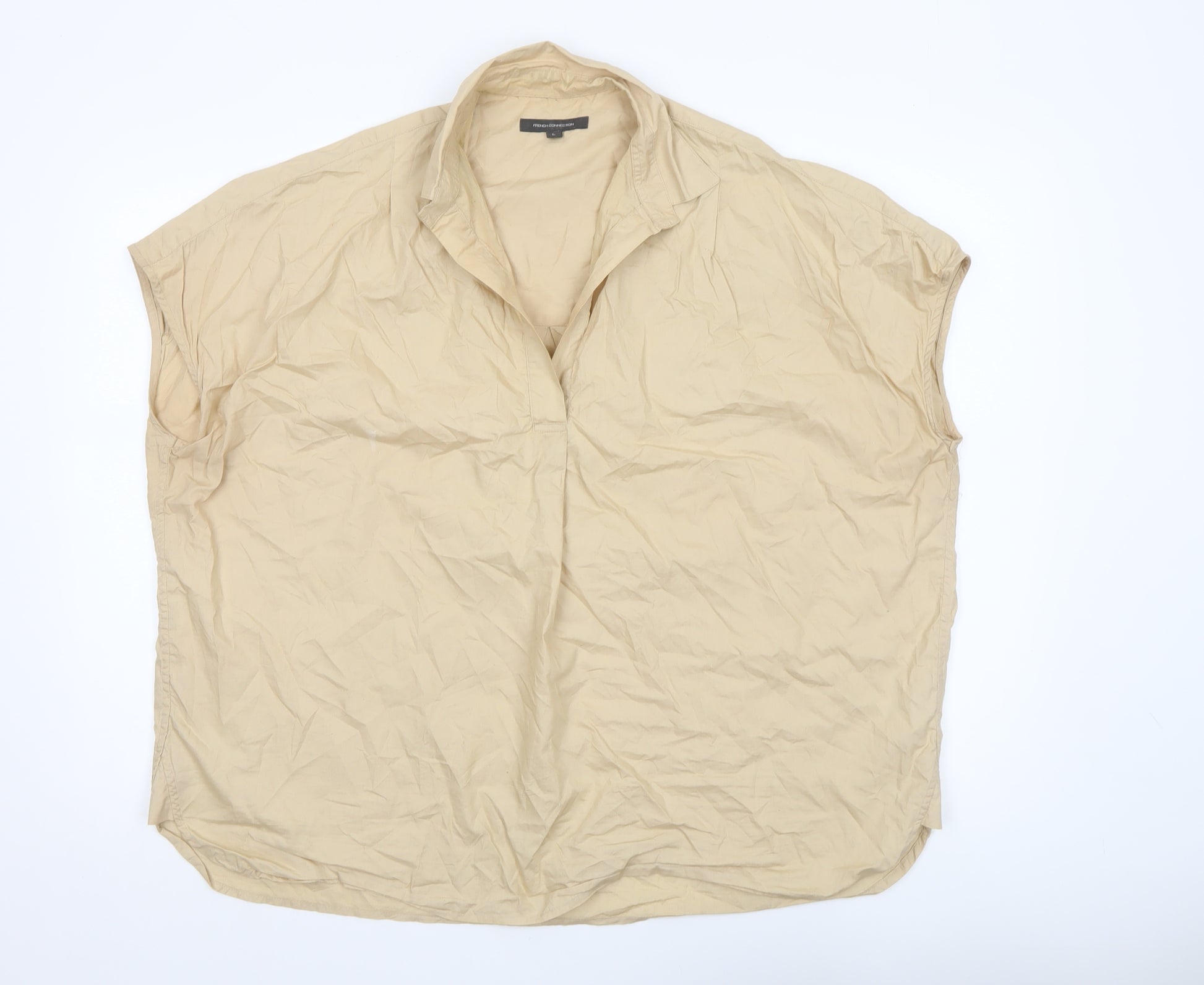Elevate your everyday wardrobe with this effortlessly chic French Connection women's blouse in a soft beige hue. Crafted from lightweight 100% cotton, this top offers breathable comfort ideal for warmer months or easy layering under jackets and cardigans. Its relaxed fit allows for ease of movement while maintaining a polished, contemporary silhouette. The collared neckline and short cap sleeves give it a flattering structure, perfect for transitioning from casual outings to laid-back workwear looks. The woven cotton fabric feels natural against the skin, combining simplicity with subtle sophistication. This blouse pairs wonderfully with tailored trousers, denim, or sleek skirts, making it a timeless addition to any wardrobe. The neutral beige tone ensures versatile styling opportunities, complementing both bold and minimalist ensembles. Designed for the modern woman seeking comfort without compromising on style, it brings together classic design and understated elegance. Condition is very good with light signs of previous wear and some natural fabric creasing. Suitable for spring and summer seasons, this piece is machine washable for easy care. Add this French Connection blouse to your collection for a versatile everyday essential that embodies relaxed refinement.