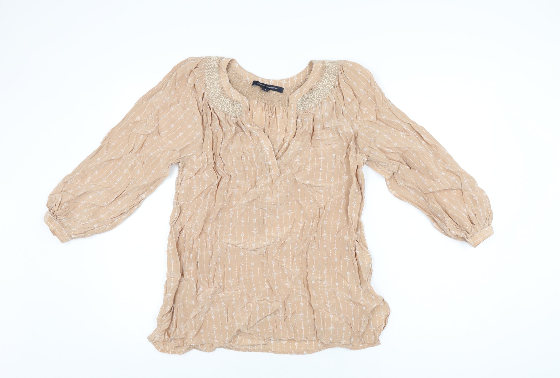 Womens Beige Floral Viscose Basic T-Shirt Size M V-Neck