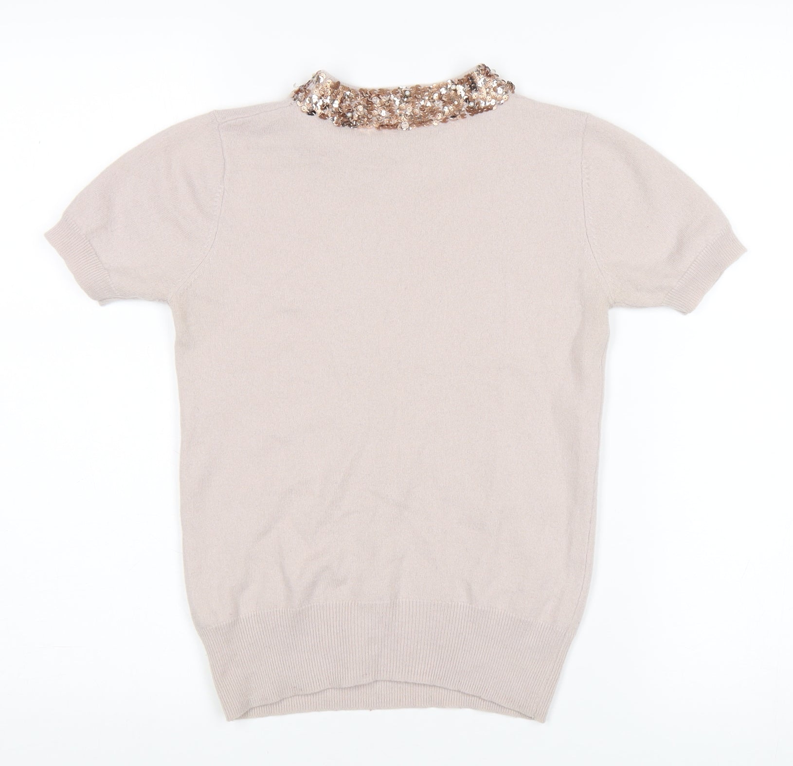 This chic French Connection jumper in a flattering XS size is a must-have for any women's wardrobe. Crafted from luxurious 100% wool, it offers warmth and comfort, ideal for various seasons. The elegant beige colour complements any outfit, easily transitioning from day to evening wear. A standout feature is the exquisite sequin accents on the collar, adding a touch of sparkle and sophistication to your ensemble. The collared neckline creates a polished look, perfect for casual and semi-formal occasions. With short sleeves, this jumper is versatile and stylish, suitable for layering or wearing on its own. Available in excellent condition, with no visible defects, this jumper promises to be a timeless addition to your clothing collection. Indulge in the quality and elegance of French Connection's design, and enjoy the ease of care with a simple hand wash. This piece is a splendid choice for those who appreciate comfort, style, and a hint of glamour.