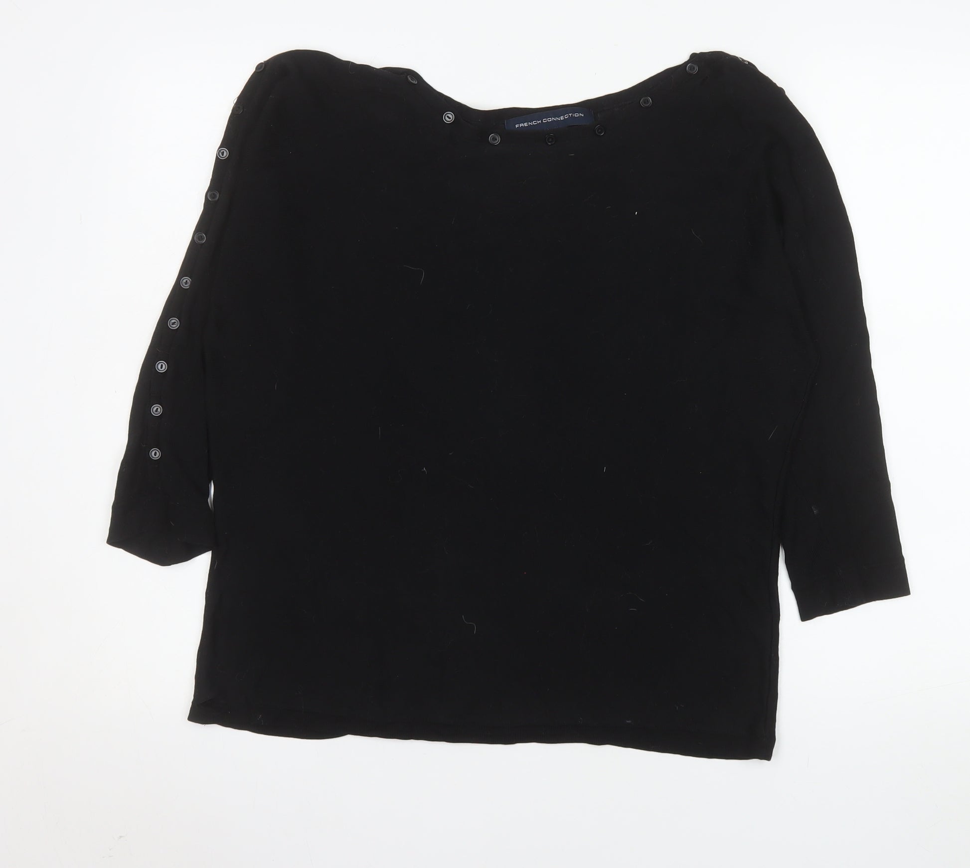 This elegant French Connection women's black blouse is a versatile wardrobe essential designed to blend comfort with classic style. Crafted from 100% viscose, the fabric offers a soft, breathable, and lightweight finish with a beautiful drape that ensures a flattering fit for everyday wear. The blouse features a subtle boat neckline that enhances its timeless silhouette, complemented by button accents along the shoulders and sleeves that add a touch of understated detail. The three-quarter length sleeves create a balanced and refined look suitable for transitional seasons such as spring and autumn. Its simple, solid black design makes it effortlessly easy to pair with both casual and smarter outfits — from tailored trousers for a polished office look to jeans or skirts for relaxed occasions. The lightweight viscose fabric ensures comfort and easy movement, while the regular fit shapes naturally without feeling too tight. This blouse is machine washable, making it simple to care for and ideal for regular use. Conditioned as very good, it shows only minor lint and light signs of gentle wear, maintaining its original appearance. Perfect for women who appreciate minimalist sophistication and modern comfort, this piece embodies the effortless elegance that French Connection is known for. Whether worn for casual days, workwear, or a relaxed evening, it’s a stylish staple you’ll reach for repeatedly. A truly versatile option that offers exceptional value in both quality and timeless appeal, this blouse completes your look with refined confidence and smart versatility.