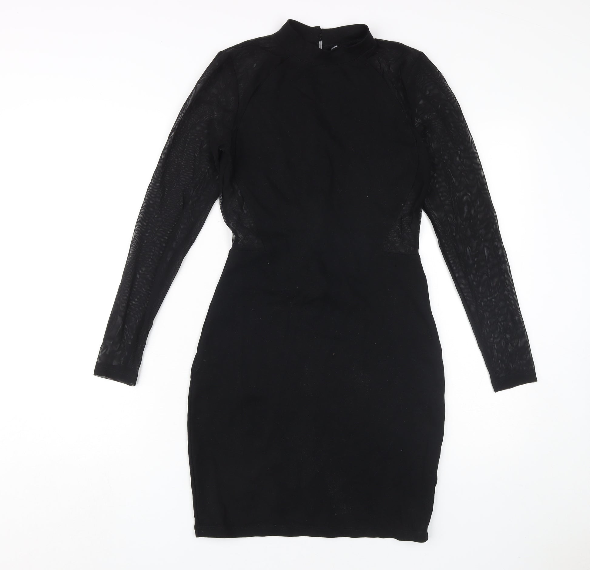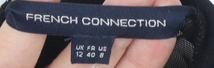 This stunning French Connection dress is perfect for any party or cocktail evening, crafted in a classic black hue. The dress showcases an elegant sheath style silhouette that elevates the figure with its form-fitting design. With its knee-length cut and high neckline, it exudes sophistication and class, ideal for autumn and winter gatherings. The long sleeves are crafted from a jersey fabric, offering comfort while maintaining a sleek look. Made from a blend of rayon, polyamide, and elastane, the dress ensures a flattering fit with a touch of stretch. The zip closure at the back secures the dress, while the sheer paneling adds a hint of allure. Easy to maintain, it is machine washable, making it practical for frequent wear. Despite slight wear on the edges, the garment is in excellent condition, ready to become a staple in your wardrobe.