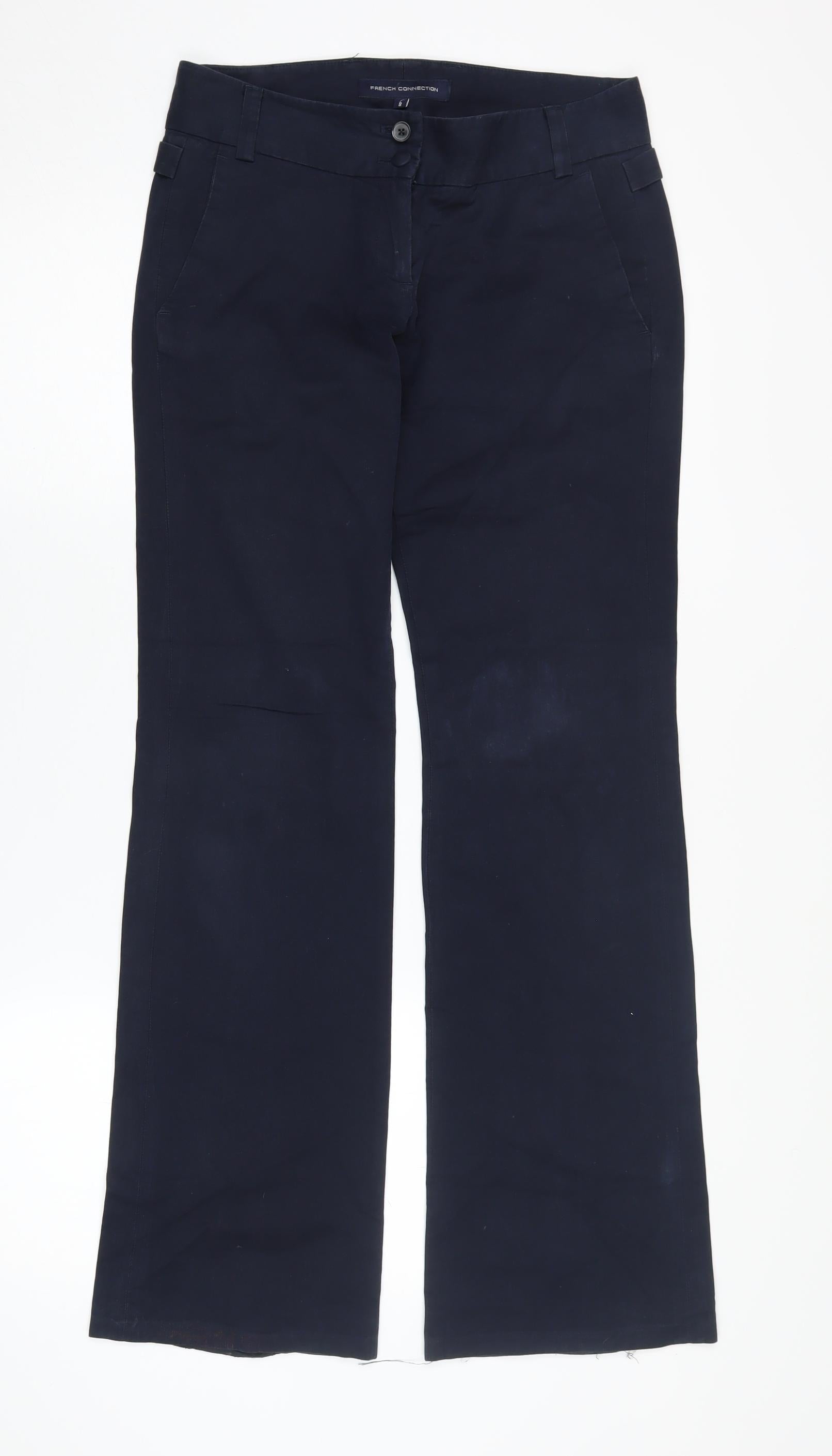 Step out in style and comfort with these elegant French Connection trousers for women. Crafted from a luxurious blend of 88% cotton and 2% elastane, they offer a slightly stretchy fit that molds to your body for a flattering silhouette. Perfect for various occasions, their versatile black shade pairs seamlessly with a variety of tops and accessories. The slim fit and straight leg style complement your figure, while the mid-rise waist ensures a comfortable, yet stylish look. With a button closure and flat front design, these trousers tick all the boxes for both fashion-forward and classic tastes. Ideal for work or casual outings, they are machine washable, making care easy and convenient. Despite slight wear, these trousers are in excellent condition, ready to be a stylish addition to your wardrobe.