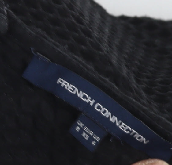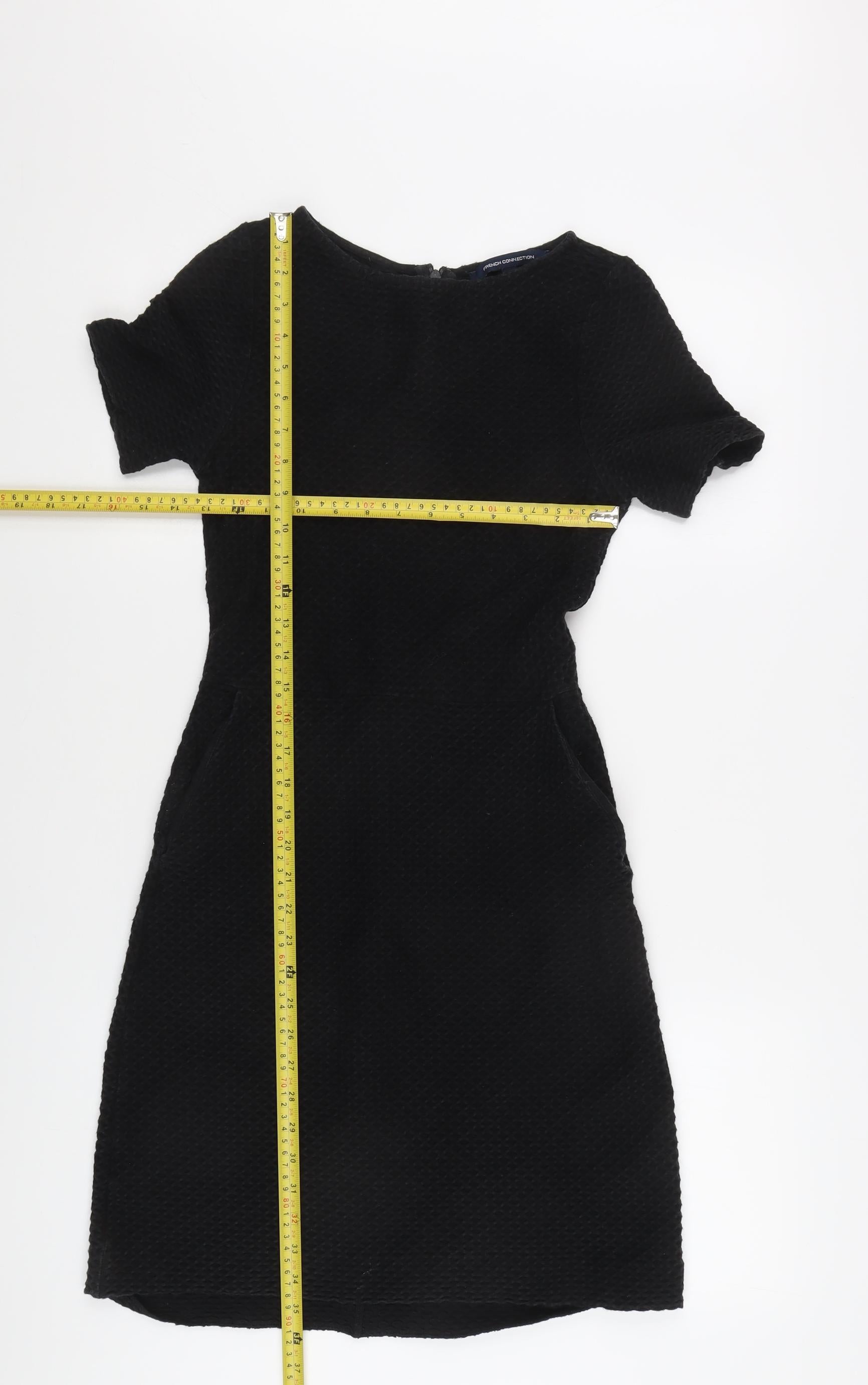 Elevate your wardrobe with this timeless French Connection women's dress, perfect for both work and casual outings. Crafted with a cotton blend fabric, this elegant black sheath dress offers a classic round neckline and short sleeves, providing a seamless fit and sophisticated aesthetic. Its knee-length design is complemented by a discreet zipper closure, making it easy to wear. Ideal for autumn and winter seasons, this versatile dress is lined for added comfort and warmth. With its chic, no-pattern design, it's an excellent choice for women looking for a blend of style and simplicity. Machine washable for ease of care, this attractive piece is a valuable addition to any fashion collection. Enjoy the luxury of feeling confident and stylish in this beautifully crafted dress.