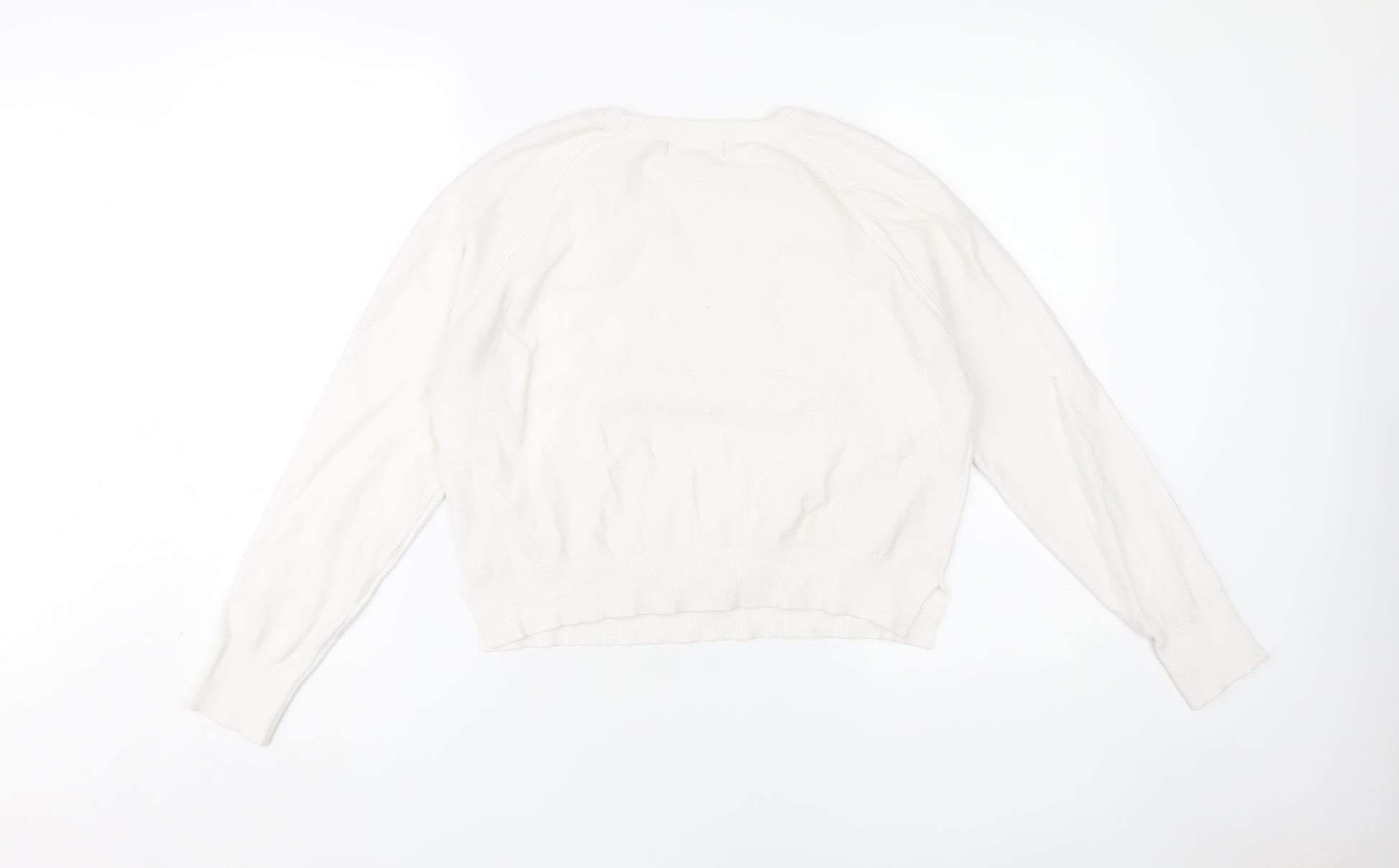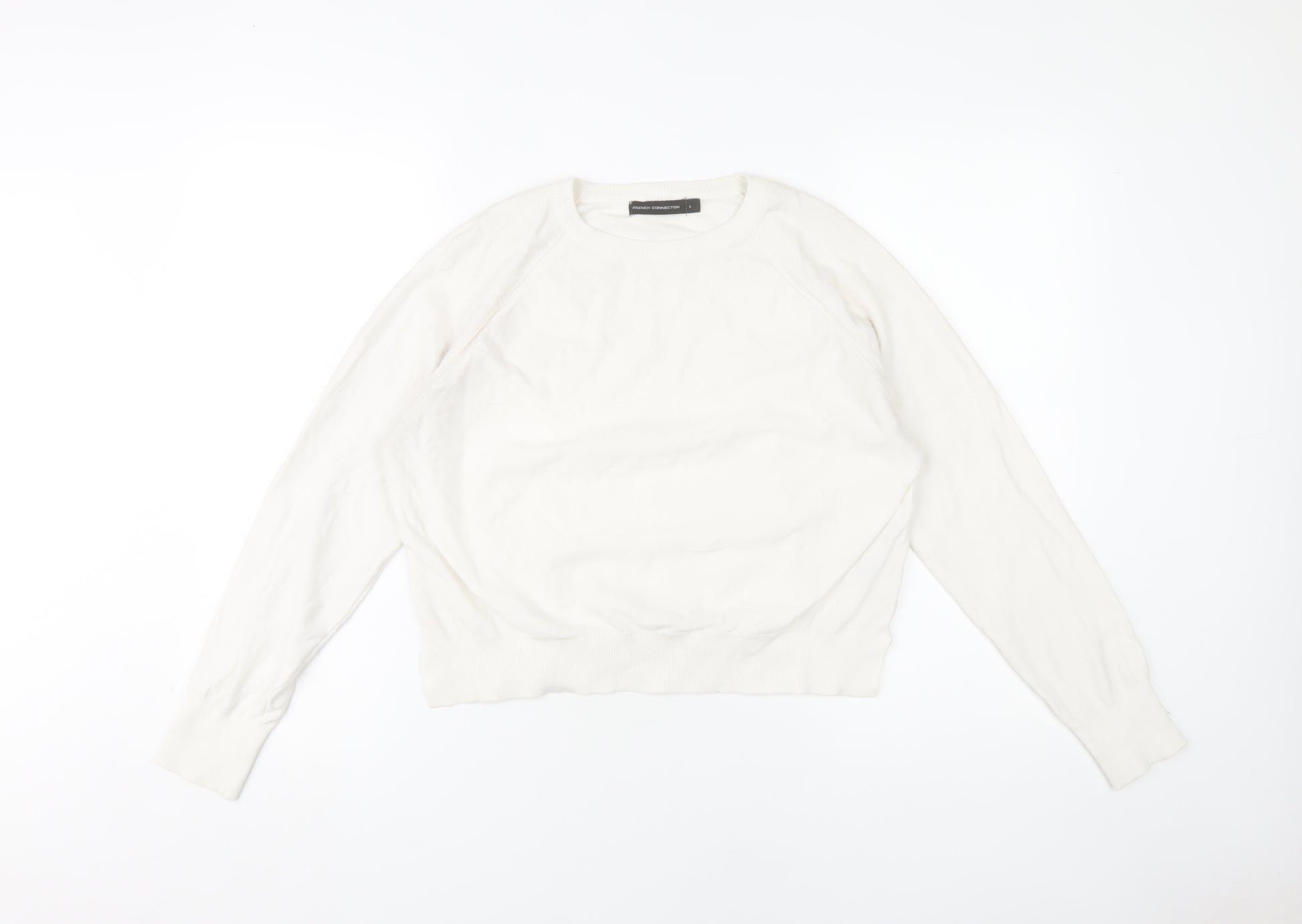 This elegant French Connection Women's Sweatshirt exudes effortless style and comfort, perfect for enhancing any casual wardrobe. In a pristine ivory hue, it offers a fresh and versatile look suitable for any season. Crafted from a soft and breathable knit fabric, featuring a blend of viscose, polyester, and polyamide, it promises durability and long-lasting quality. The long sleeves and classic crew neckline ensure a timeless appeal, while the raglan sleeve design adds a touch of sophistication. Ideal for relaxed outings, this sweatshirt maintains a regular fit, catering to a variety of body types while providing comfort and flexibility. As an excellent used item, it exhibits no visible wear or damage, making it an ideal choice for fashionable layerings or standalone wear. Elevate your everyday attire with this stylish and contemporary French Connection piece.