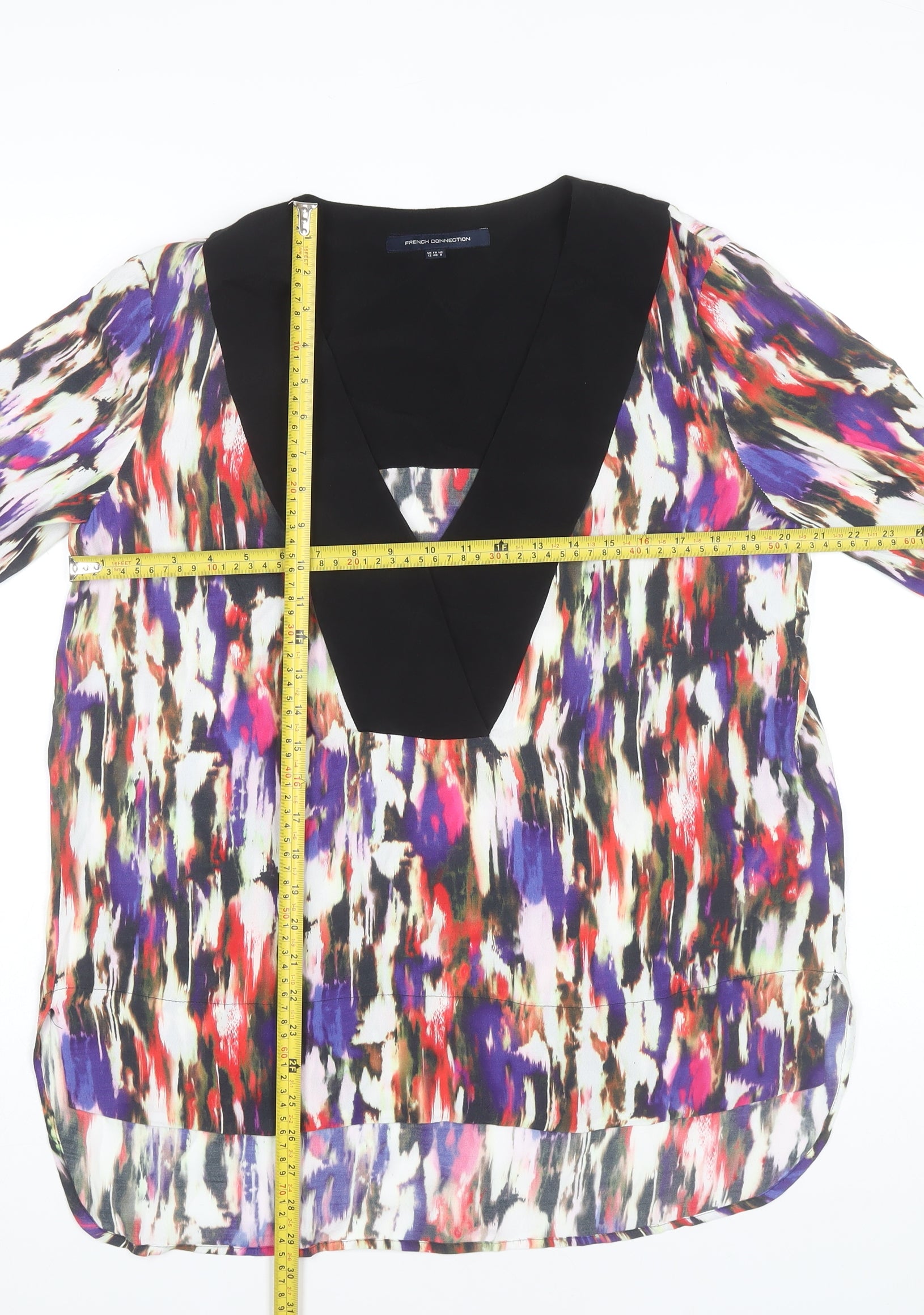Step into effortless style with this striking French Connection women’s blouse, designed to elevate both casual and smart-casual occasions. Crafted from 100% viscose, this chic blouse offers a lightweight, soft-to-the-touch finish that drapes beautifully, ensuring comfort as well as sophistication. The blouse is cut in a flattering tunic style, combining relaxed elegance with a versatile silhouette that suits multiple body shapes.The multicoloured abstract pattern is bold and eye-catching, featuring vibrant hues of purple, pink, red, black, and ivory that bring an artistic energy to your wardrobe. Balanced with solid black details at the neckline and cuffs, the design is contemporary and stylish, making this piece a perfect statement garment. The deep V-neckline adds a modern edge, great for layering with camisoles or showcasing jewellery.The full-length fitted sleeves with contrasting cuffs make it suitable for transitional seasons such as spring and autumn, while the breathable viscose fabric ensures cool comfort in the summer too. As a pullover style, this versatile blouse is easy to wear, offering both practicality and chic flair for everyday dressing or social events. Perfectly paired with jeans for a daytime look or tailored trousers for a more dressed-up ensemble, it can seamlessly transition from workwear to evening wear with ease.This blouse comes in a UK size 12, ideal for women seeking both comfort and fitted elegance. With machine washable easy-care fabric, maintenance is convenient without sacrificing quality. In excellent condition, this blouse shows minimal signs of wear, ensuring a near-new look at outstanding value.Perfect for casual outings, parties, or social occasions, this French Connection blouse makes a vibrant addition to any wardrobe, offering both sophistication and bold personality. A must-have for those wanting versatility and standout design in their collection.