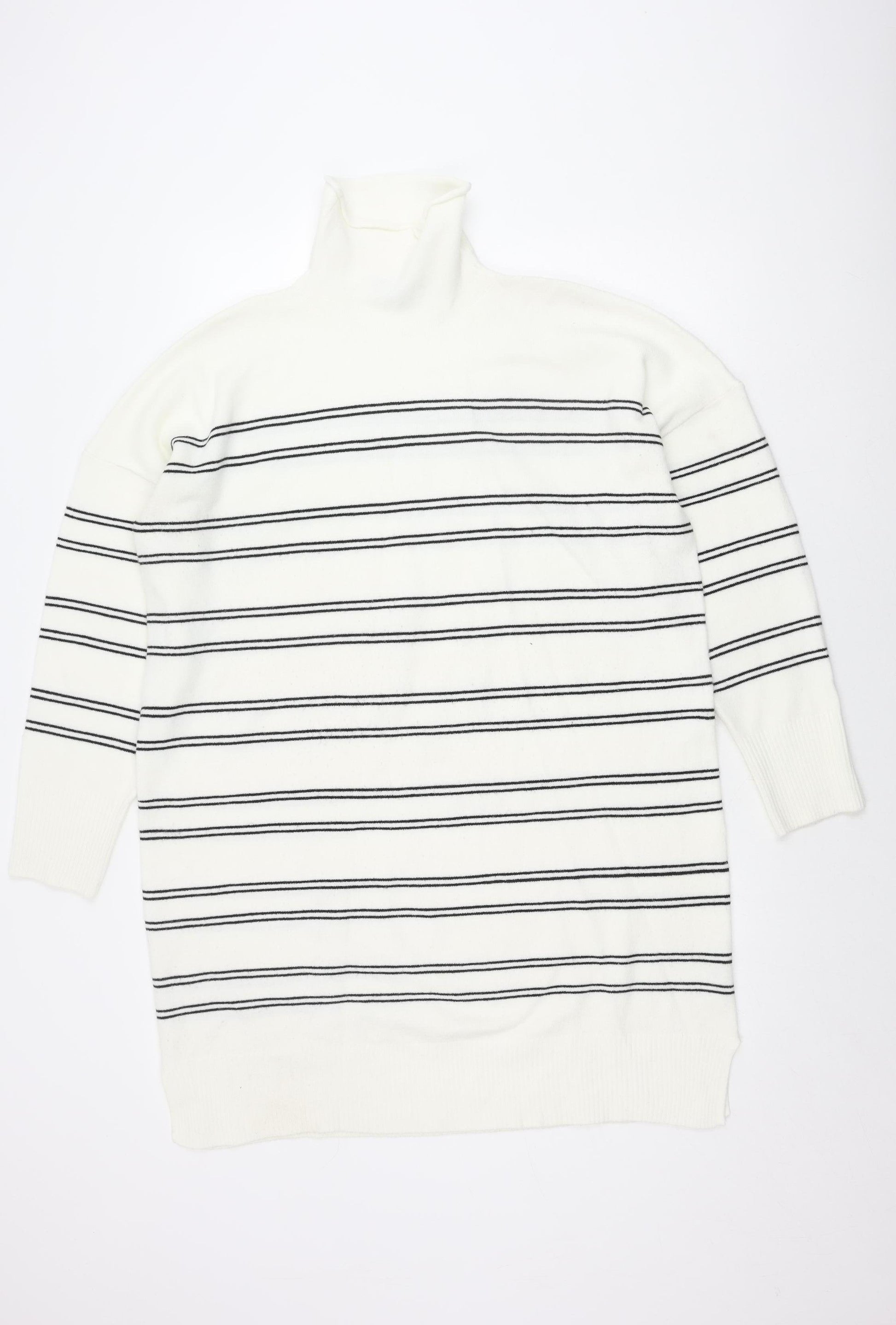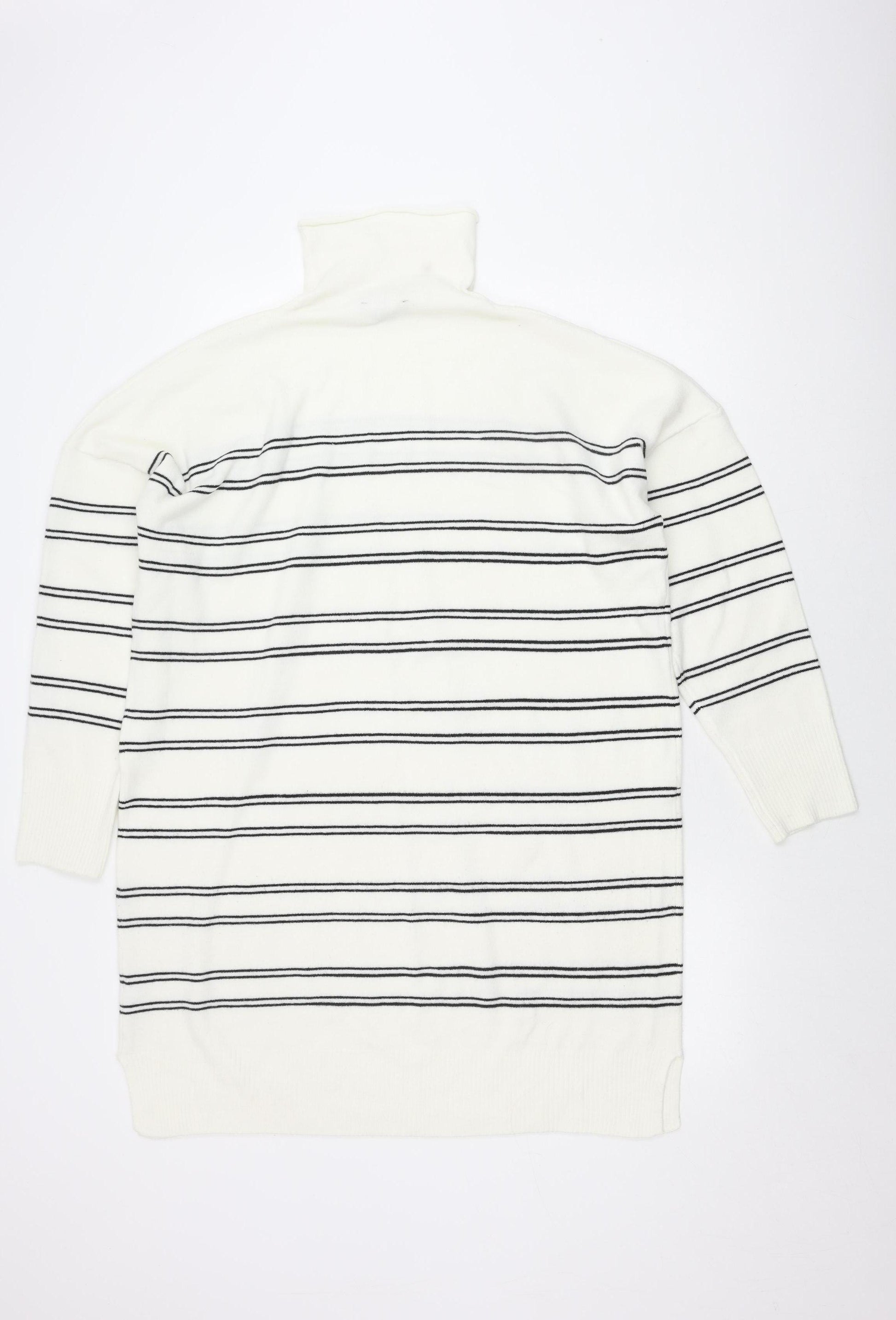 Enhance your wardrobe with this chic French Connection women's sweater, designed in a classic stripe pattern that gives a timeless appeal. Crafted from a high-quality blend of acrylic, nylon, wool, and elastane, this knit sweater ensures warmth, durability, and a snug fit, perfect for the colder months. The roll neck design and long sleeves add a touch of sophistication, making it an excellent choice for layering under coats or wearing as a standalone piece. This regular fit sweater in a pristine white shade is versatile enough to be paired with jeans for a casual day out or dressed up with trousers for a smarter look. Elevate your style with this elegant piece, suitable for any fashion-conscious individual looking to add a staple to their collection.