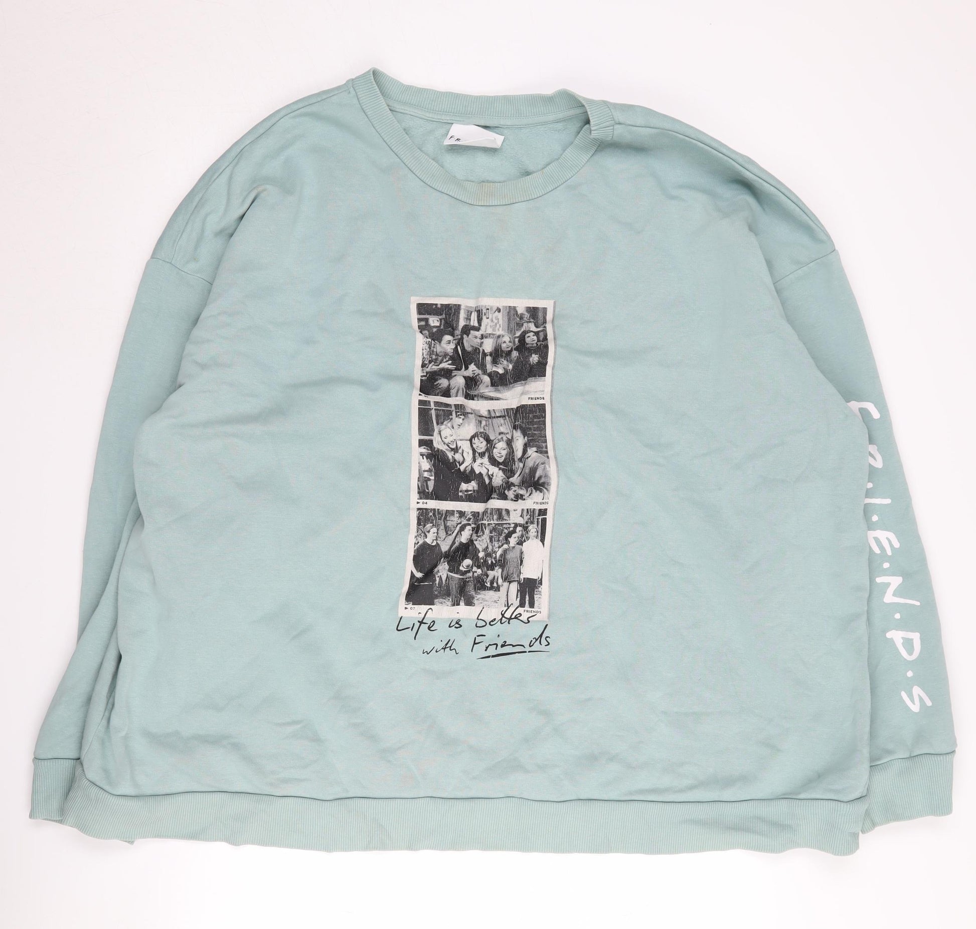Step out in style with this trendy Friends-themed sweatshirt, perfect for any fan of the iconic TV show. In an inviting green hue, this unisex sweatshirt offers both comfort and style, making it the perfect addition to your casual wardrobe. Crafted from a soft jersey fabric, it features a comfortable blend of cotton, polyester, and elastane, ensuring durability and a relaxed fit. The graphic print embodies the nostalgic spirit of the show, making it a great conversation starter. With an oversized fit and long sleeves, this casual piece is designed for all-day comfort, whether you're binge-watching your favourite episodes or stepping out for a casual outing. The pullover design with a crew neck ensures easy wear, while the breathable fabric makes it suitable for all seasons. Though slightly pre-loved, with a minor stain on the back, this sweatshirt maintains its charm and appeal. Machine washable for easy maintenance, it promises to be a staple in your wardrobe. Embrace a touch of 90s nostalgia while staying effortlessly chic with this relaxed-fit Friends sweatshirt.