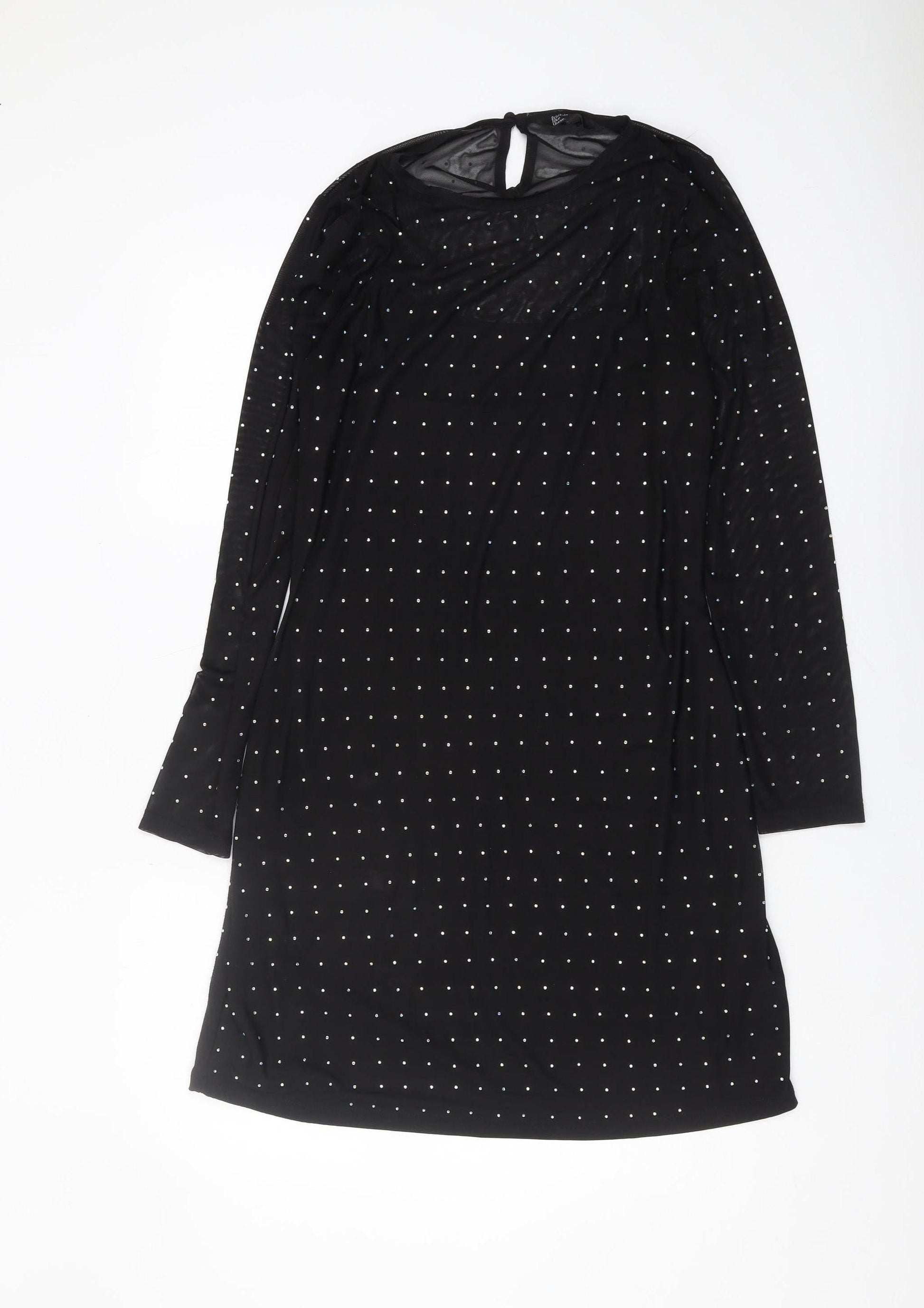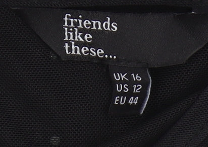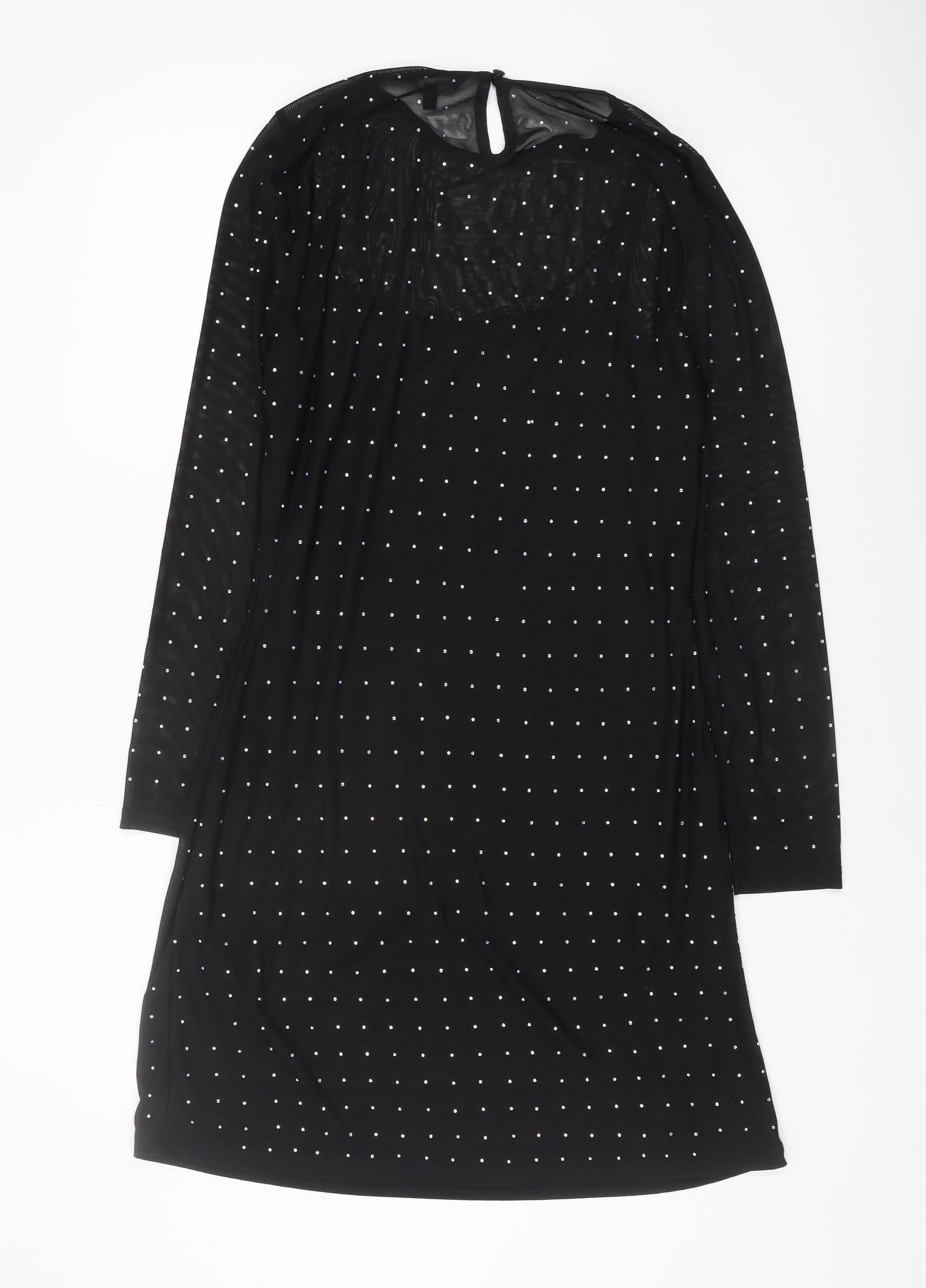 Discover elegance with 'Friends Like These' black dress, perfect for a touch of sophistication. Crafted in size 16, this women's dress features a chic studded design against classic black, offering a sleek, stylish silhouette. The long sleeves provide warmth and grace, while the polyester and elastane blend ensures comfort and ease, making it machine washable for convenient care. Ideal for evenings out or sophisticated daywear, this dress exudes class without compromising on comfort. Accessories not included. Condition: excellent, with minimal wear, it’s perfect for those looking for subtle sophistication in their wardrobe.