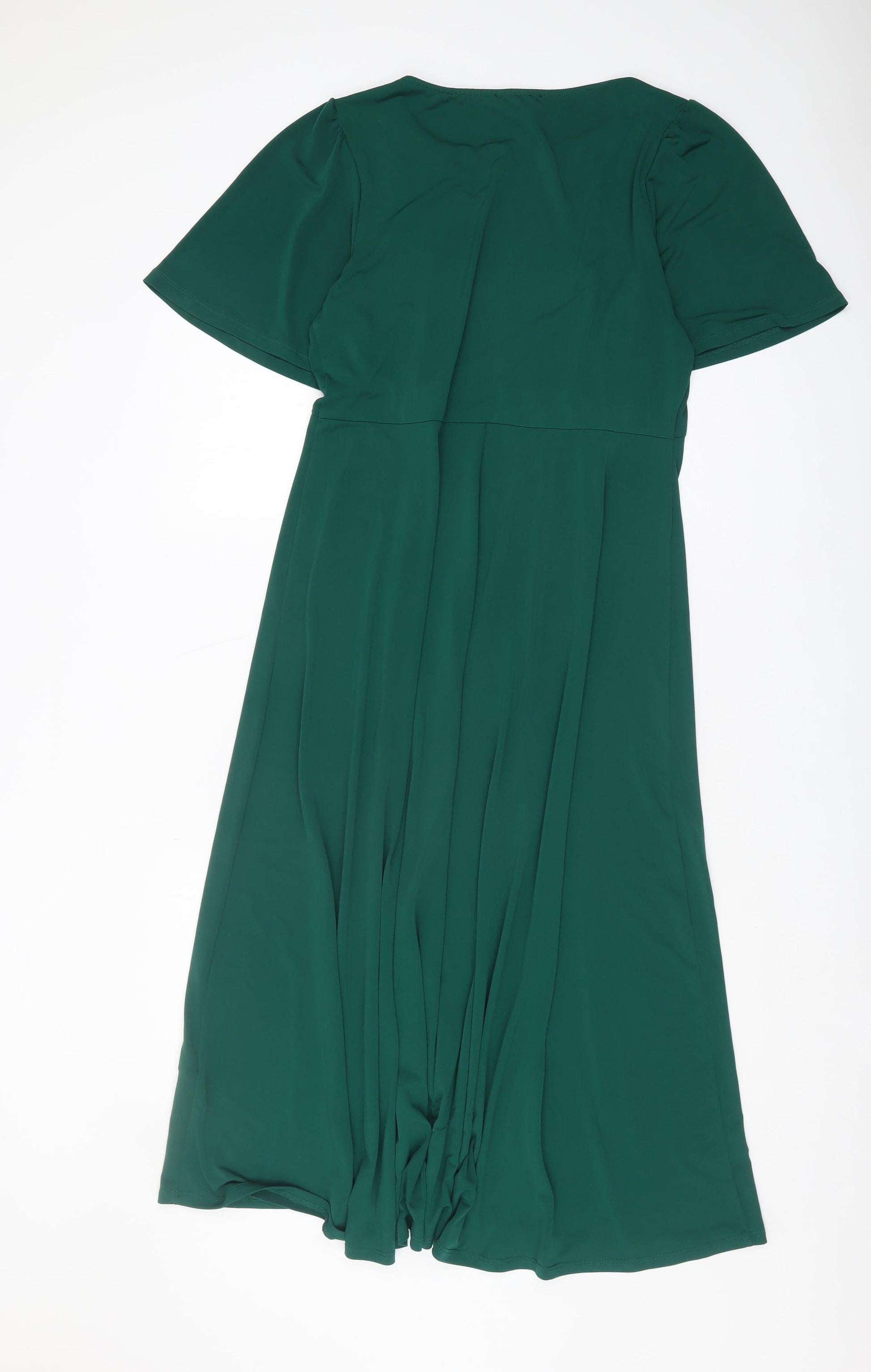 Discover elegance with this beautiful Friends Like These Women's Green Midi A-Line Dress, perfect for both casual and formal occasions. Crafted in a stunning shade of green, this dress is a versatile addition to your wardrobe, designed to enhance your style whether you're heading to a garden party or a special event. Made from a blend of polyester and elastane, the dress provides a soft jersey feel while ensuring a comfortable fit. The lightweight fabric ensures breathability, making it an ideal choice for the warmer spring and summer seasons. The dress features a flattering round neck and has short, flutter sleeves that add a touch of femininity to the overall design. Its simple A-Line style offers a timeless silhouette, ensuring you look effortlessly chic. The size 12 fits perfectly, providing both comfort and style without compromising on elegance. Though pre-owned, it remains in excellent condition with no visible defects, ensuring you receive a high-quality piece that is as good as new. Pair it with your favourite sandals for a casual daytime look, or dress it up with heels and statement jewellery for a more formal occasion. The dress is machine washable, promising easy care and maintenance. Elevate your fashion collection today with this stylish and economical choice.