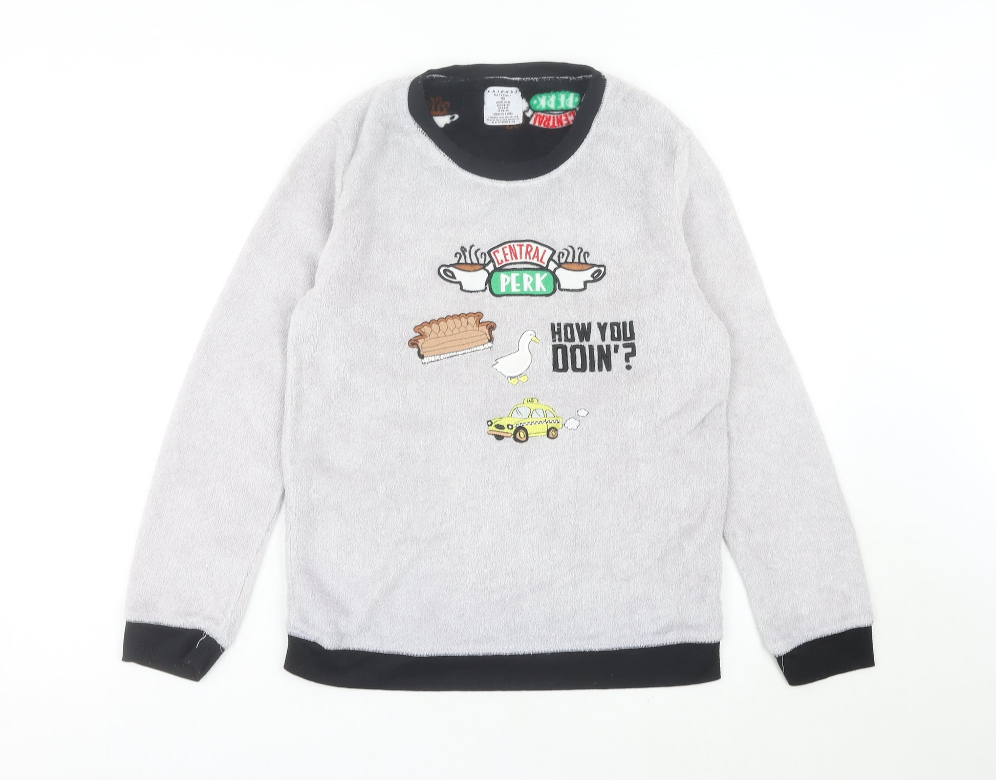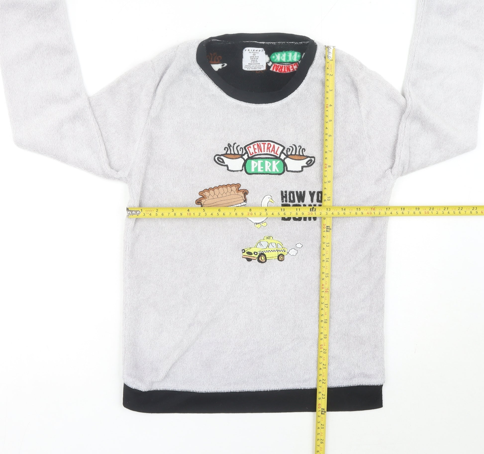 Wrap yourself in cosy style with this officially licensed Friends The TV Series women's pyjama top. Perfect for chilly evenings or laid-back weekends, this top is crafted from 100% soft polyester fleece, designed to keep you warm and comfortable. Its grey body is accented with fun, iconic motifs from the Friends series, including the famous Central Perk logo, the orange sofa, and classic quotes that fans will instantly recognise. The black crew neck and matching cuffs add a sleek contrast, making this pyjama top not just practical but stylish too.The pyjama top comes in a UK women's size 10-12 (Small), offering a comfortable regular fit with long sleeves for extra warmth. Lightweight yet snug, this fleece top is ideal for lounging at home, bedtime, or pairing with pyjama bottoms on lazy days. The embroidered and printed accents bring a playful and nostalgic feel, making it a must-have for Friends enthusiasts.Machine washable for easy care, this top ensures fuss-free maintenance while retaining its softness and colour. With its versatile design, it is suited for autumn and winter wear, keeping you cosily stylish throughout the colder seasons. Condition is excellent, showing light general wear but no flaws, rips, or stains, ensuring it remains in great wearable shape.Whether you’re treating yourself or searching for the perfect gift for a Friends fan, this top is a great choice. Its combination of pop culture appeal, comfort, and style makes it a standout addition to any nightwear or loungewear collection. Step into the world of Friends and enjoy a cosy night in that feels just as iconic as your favourite episodes.