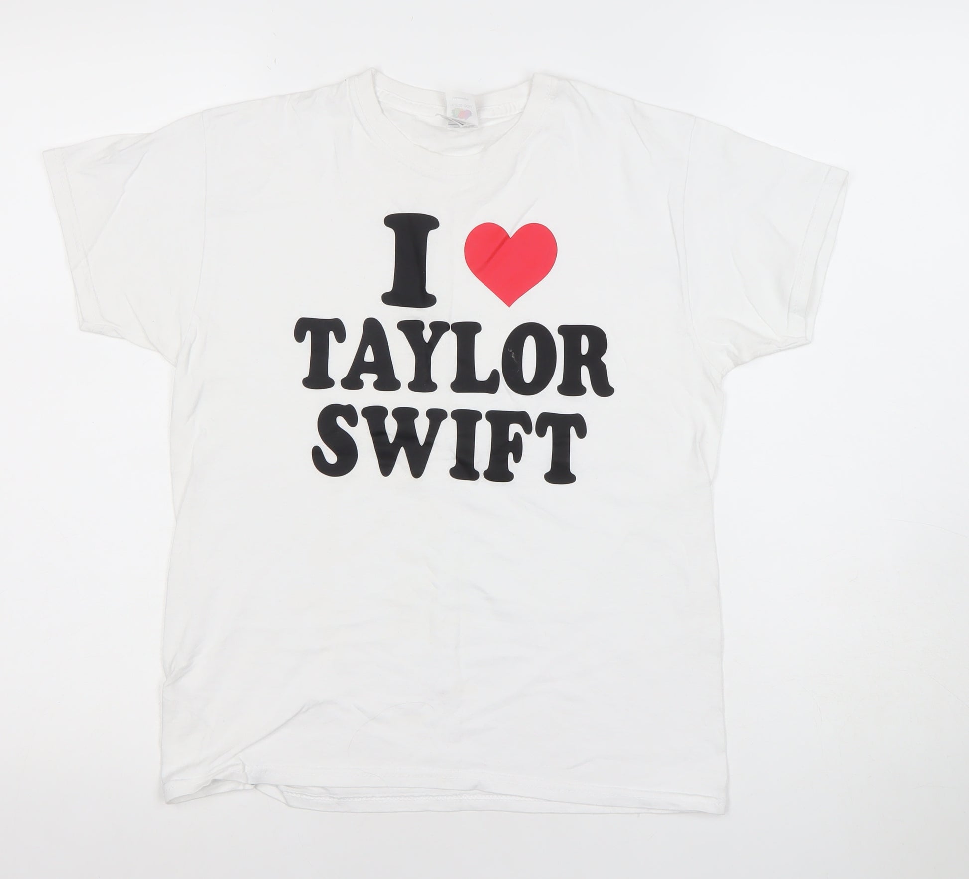 This Fruit of the Loom girls’ graphic T-shirt is a must-have for any young fan looking to combine comfort with style. Designed in crisp white cotton, this short sleeve top features a bold 'I ♥ Taylor Swift' graphic print across the front, making it an ideal choice for casual wear, parties, or fun outings. The breathable, lightweight jersey fabric ensures comfort all day long, while the easy-care finish makes it practical for everyday use. Made from 100% soft cotton, the T-shirt is gentle against the skin and suitable for sensitive skin types. The crew neck and regular fit add classic appeal, while the simple pullover design ensures ease of wear. With a chest size of approximately 70 cm and suitable for around 10 years of age (9-11 years/140 cm), this T-shirt is well-proportioned for growing kids.Perfect for spring and summer, this top makes a great choice for warmer weather. Whether worn to school, during outings, or at themed parties, its casual yet iconic design adds a fun flair. The bold print embodies a music and celebrity-inspired theme, particularly appealing to fans of pop icons. Subtle branding accents highlight Fruit of the Loom’s well-known quality in kids’ clothing.Condition is graded as 'Very Good', showing only light signs of previous wear with no visible stains, snags, or damage. With no sales tags present, it maintains excellent presentable condition, making it a great second-hand buy at excellent value. This versatile piece works well paired with jeans, skirts, or shorts, and is bound to become a favourite in any wardrobe. Combining durability, comfort, and a distinctive themed print, it’s a stylish way for young fans to showcase their personality while staying comfortable throughout the day.