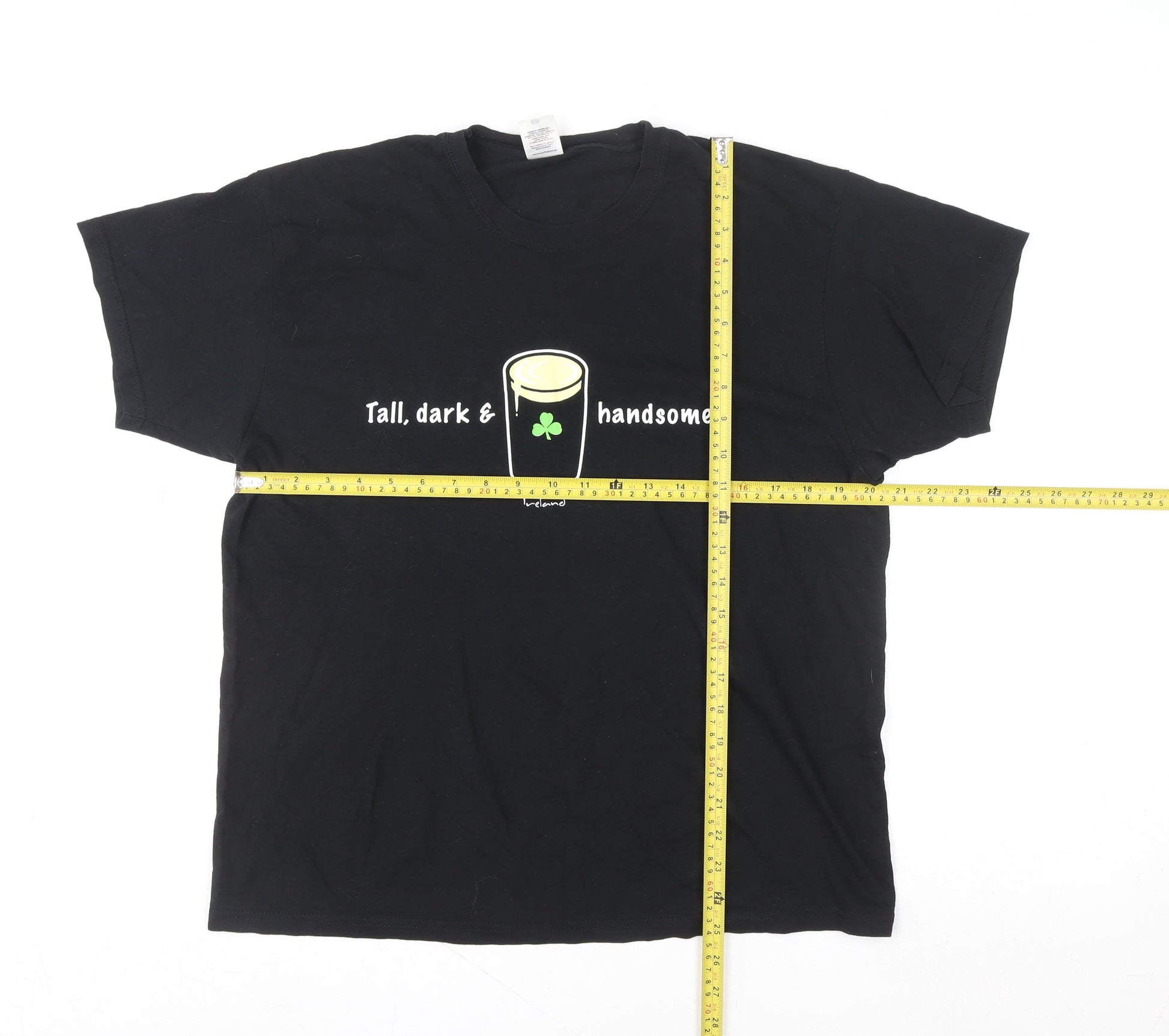 Show off your personality with this fun and casual Fruit of the Loom 'Tall, Dark & Handsome' T-shirt — perfect for any man who enjoys a touch of humour in his wardrobe. Made from soft and breathable 100% cotton, this black crew neck tee ensures all-day comfort whether you're lounging at home, heading to the pub, or spending time outdoors. The lightweight jersey fabric offers a relaxed fit that drapes naturally across the body, providing easy movement and a classic look. Featuring a bold front print design showcasing a pint glass with a shamrock and the witty slogan 'Tall, Dark & Handsome', this tee seamlessly combines humour and style with an Irish-inspired twist. Ideal as a casual statement piece, it pairs effortlessly with jeans or shorts for a laid-back outfit that still grabs attention. Designed by Fruit of the Loom, a brand known for quality basics, this short sleeve T-shirt is machine washable and durable enough to keep its shape and colour through many wears. It’s a great pick for men who appreciate comfort, style, and a bit of playful charm in everyday wear. With its breathable cotton composition, it's especially suited for spring and summer, ensuring coolness throughout the warmer days. Whether bought for yourself or as a gift for a friend with a great sense of humour, this T-shirt captures a classic look with a light-hearted, pub-inspired theme. Subtle yet fun, it’s easily your go-to top for casual social settings or relaxed weekends. Conditioned in very good pre-owned shape with minimal signs of wear, it continues to have plenty of life left for years of enjoyment. A fantastic value option for quality and comfort combined.