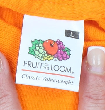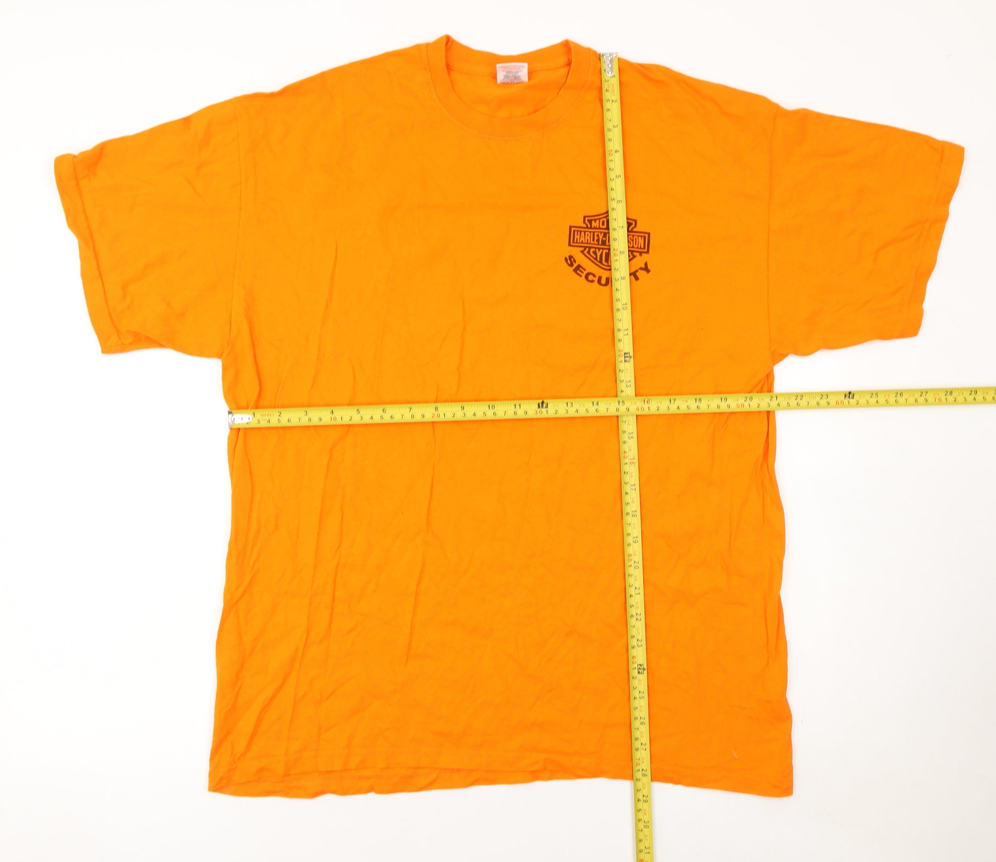 Add a bold touch to your wardrobe with this Fruit of the Loom 'Harley-Davidson Security' men's T-shirt in vibrant orange. Designed for those who appreciate comfort and classic style, this tee features the iconic Harley-Davidson shield logo printed on the front chest and a bold 'SECURITY' print across the back. Constructed from soft and breathable 100% cotton jersey, the shirt offers day-long comfort whether worn casually or at events. The classic crew neckline and regular fit make it a versatile choice suitable for casual outings, biker meets or weekend wear. Its short sleeves and lightweight nature ensure cool comfort during warmer months, making it ideal for summer or layering under jackets in cooler weather. The simple yet striking graphic print delivers attitude and character, ideal for anyone who loves motorcycle-inspired fashion or vintage Harley designs. Made in the trusted Fruit of the Loom Classic Valueweight range, this T-shirt combines durability with a soft touch. The orange hue adds vibrancy and visibility, while the professionally printed graphics ensure a lasting finish that stands up to repeated washing. Machine washable for easy care, it’s a practical and eye-catching addition to any casual wardrobe. Condition is excellent with no noticeable wear or defects besides light creasing from storage. This is a pre-owned shirt that’s been well kept and ready to wear. Perfect for Harley-Davidson fans, security staff, or collectors of biker-themed apparel, this tee blends comfort, style, and brand appeal effortlessly. Get noticed for all the right reasons—pair it with black jeans or denim shorts for a laid-back yet bold statement look. This piece reflects the timeless culture of Harley-Davidson and the reliability of Fruit of the Loom quality, ideal for casual days or enthusiast gatherings.