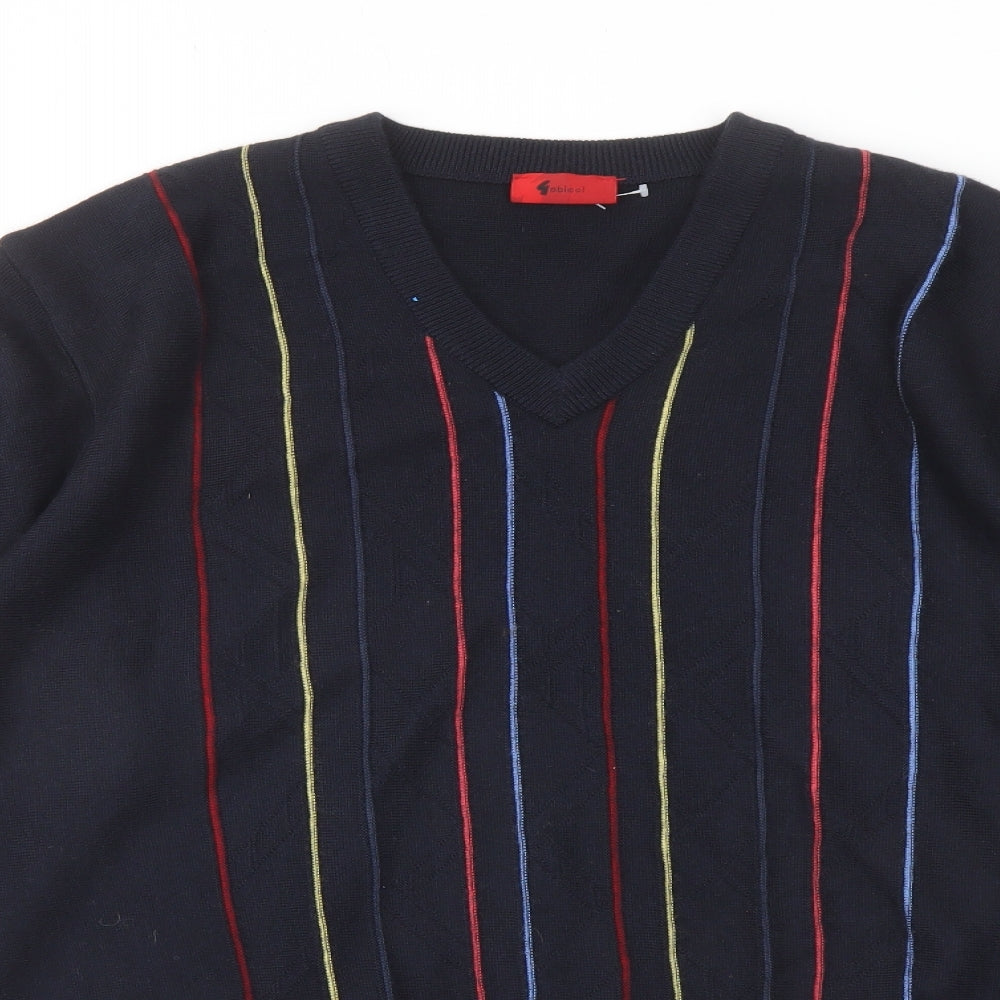 Mens Blue V-Neck Striped Wool Pullover Jumper Size L Long Sleeve